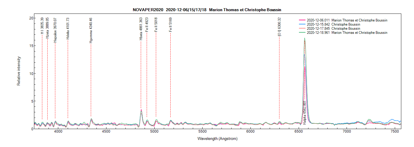 Nova Per 2020 on December 6th, 15th, 17th and 18th, 2020 (identification of some lines from PlotSpectra).