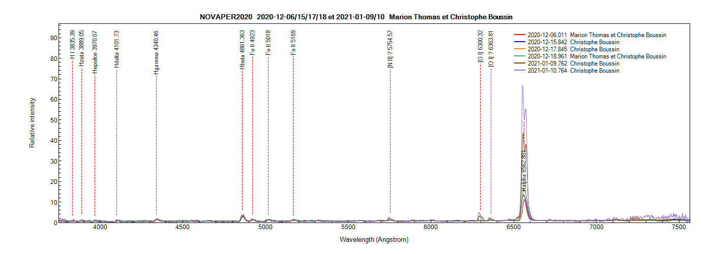 Nova Per 2020 on December 6th, 15th, 17th, 18th, 2020 and January 9th and 10th (identification of some lines from PlotSpectra)