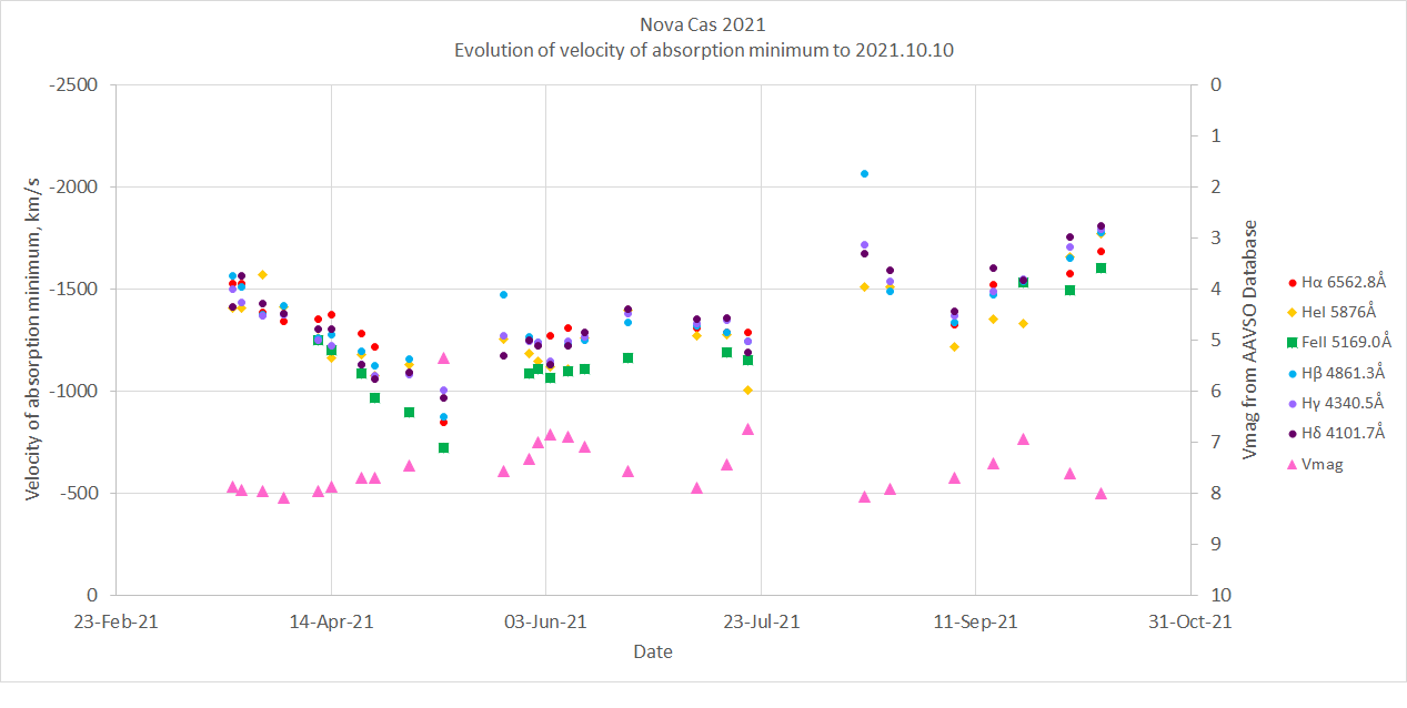 I have continued to follow the evolution of the expansion velocity, using the blue shifted absorption minimum on the shoulder of many of the emission lines. At the resolution of my Alpy 600 spectroscope, such P Cygni profiles have remained strong for all of the Balmer lines Hβ and above. In Hα and HeI (5876Å) there have been brief periods of disappearance whilst the P Cygni profile on the FeII (5169Å) emission was not observable for much longer periods, particularly during August and early September. When observable the FeII (5169Å) absorption velocity has almost always been the lowest. On a given date the velocity sequence in the other lines has been quite variable but the overall trend in absorption velocity shows an inverse link to the Vmag of the nova: