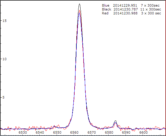 Might be interesting an initial spectrum (R~6000) taken at 17:33 UT before changing the grating that shows an asimmetric h-alpha line (a possibile detached component on red side?). Consider a very low SNR and a strong turbulence for this profile. No asymmetry was visible in the spectrum taken on December 21 with the same setup.