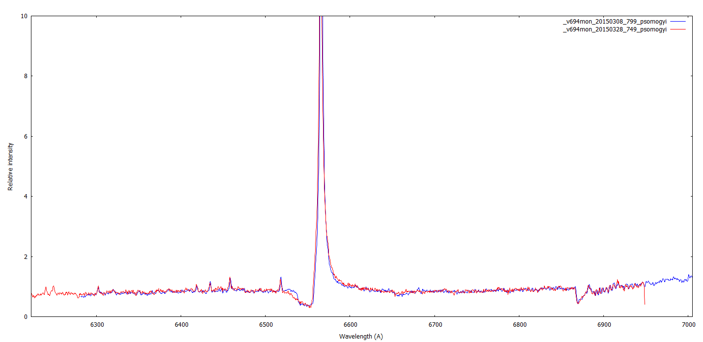 Observation of V694 Mon the 9.8 Feb. with a C11 and a Lhires III (1800 lines/mm grating for a R = 8800 resolution power). 35 microns slit wide :