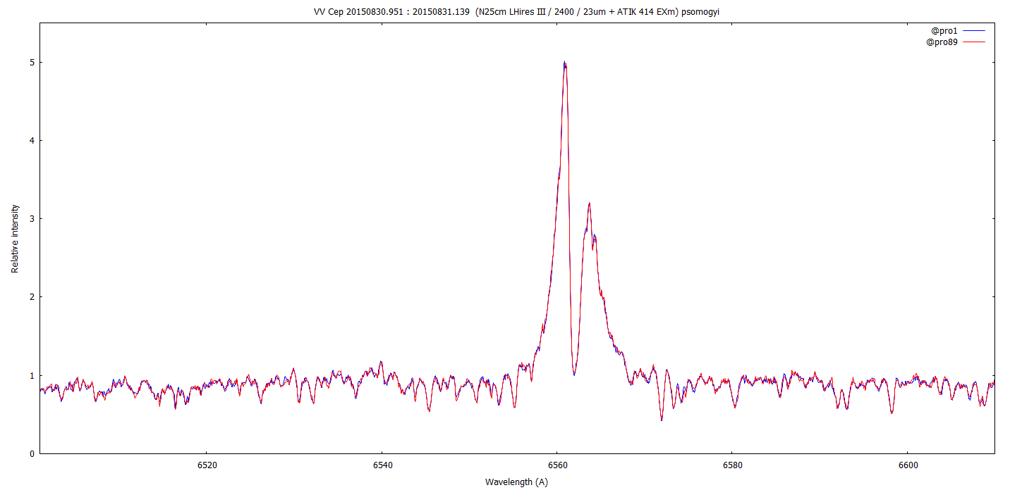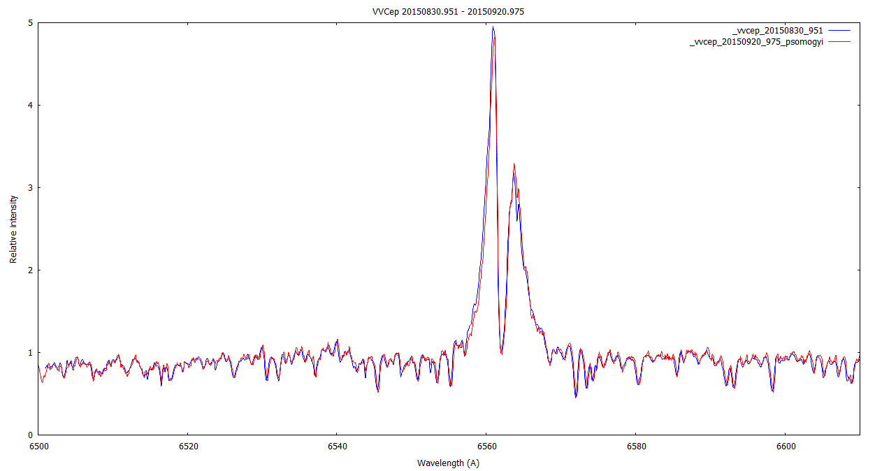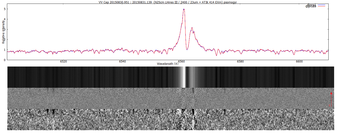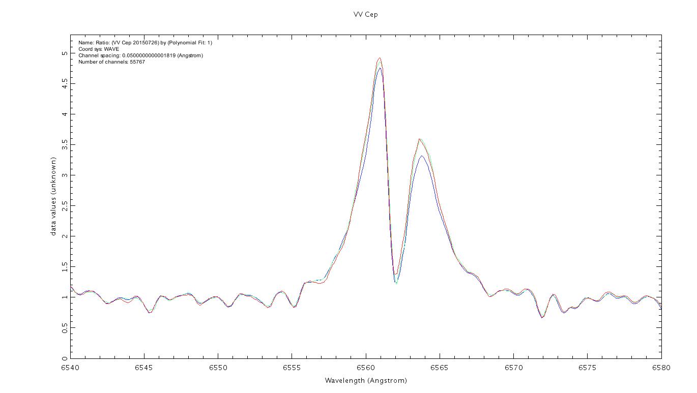 as VV Cep is a long term variable (20+ years), my intent was to get a spectrum every two weeks or so. But by comparing my last spectra, I realized that the Halpha emission was varying compared to the continuum: