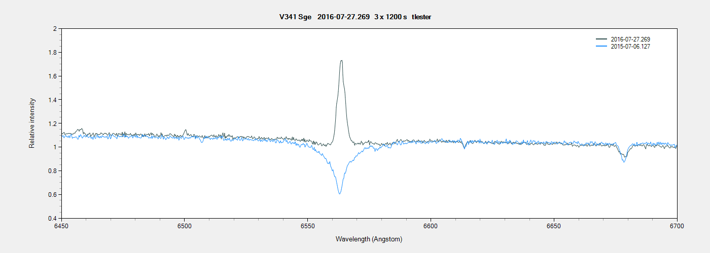 Hi all, My spectrum from last night shows V341 Sge in an active state. The last spectra in BeSS (July 2015) shows Halpha in absorption.