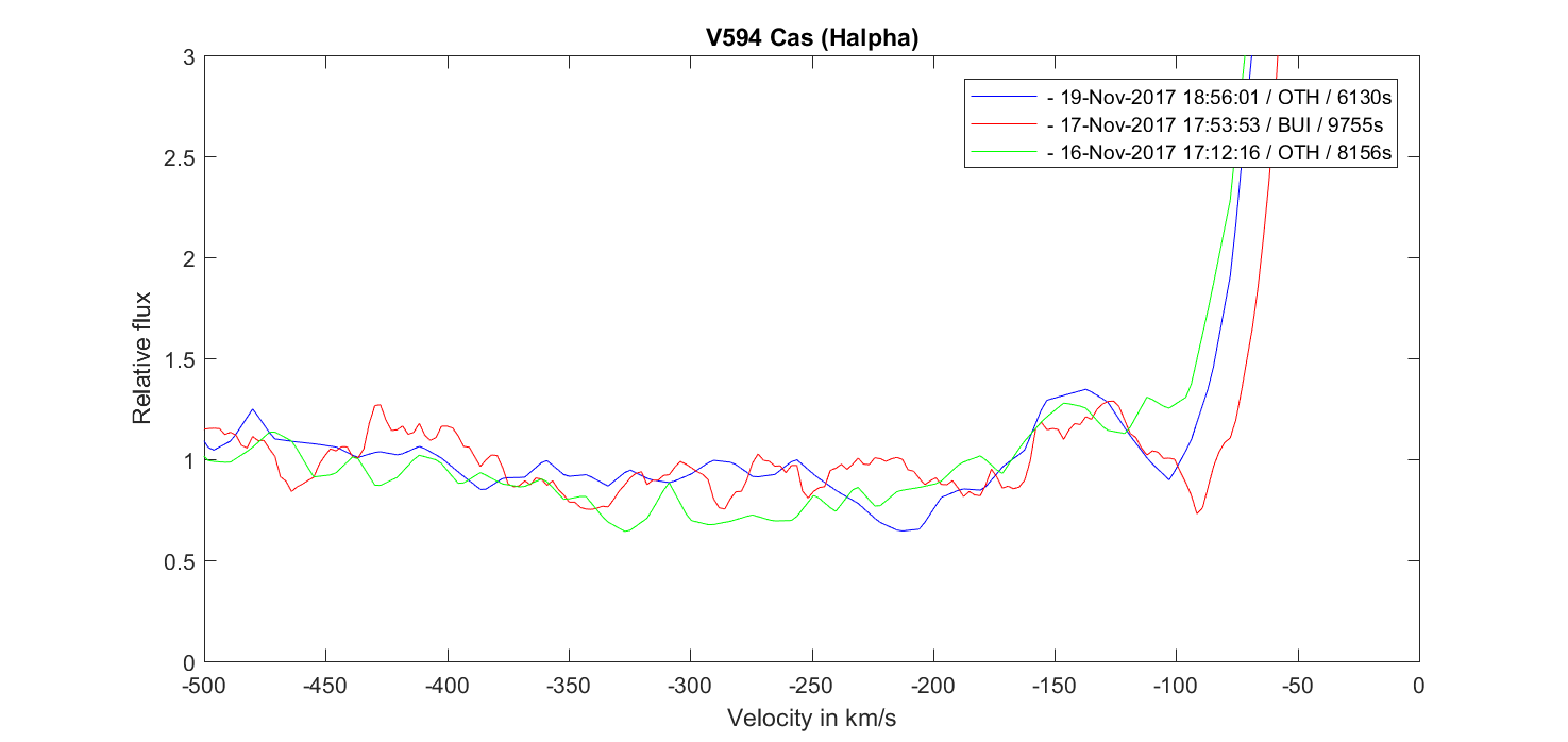 Helpha was showing a P Cygni profile with absorption near -300km/s on nov 16th but absorption disapeared the following night with a small emisson appearing near -150km/s. Then an small absorption was added near -200km/s last night.