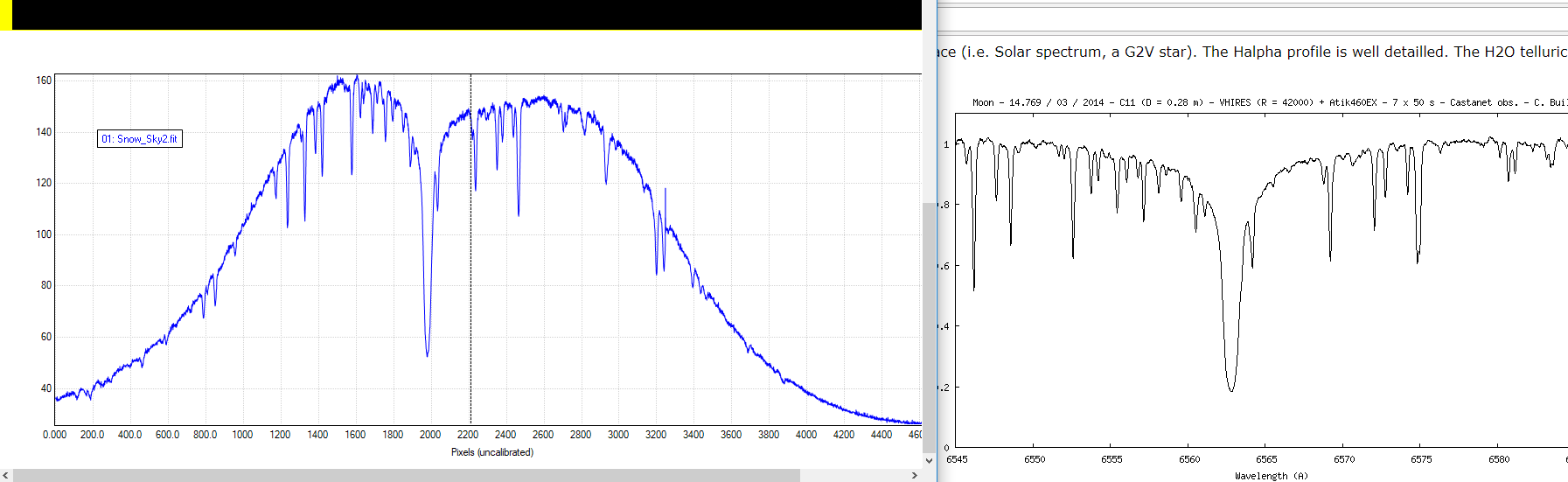 Just for fun a comparison of VHIRES on the moon and a snowy day in Delamere. You can see the difference in resolution and spectral range. Obviously I have not removed the Blaze yet on my spectra.
