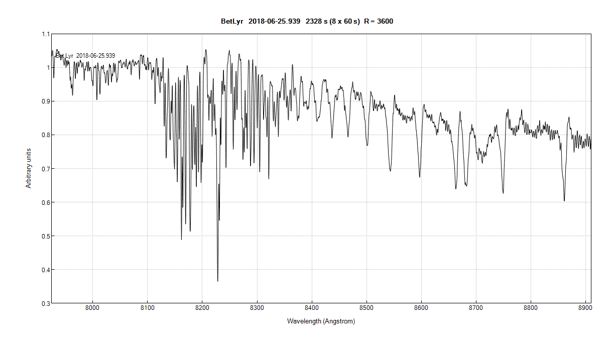 Ces même raies dans Bet Lyr, une mine d'informations à analyser : CH Cyg, avec des raies en émission noyées dans une forêt de raies telluriques, et de jolies bandes moléculaires: Kap Lyr (K2-IIIabCN0.5 B), dont on voit très bien le triplet de Calcium: Et une comparaison entre V*V Cep et 18 Cep (M5III candidate variable à longue période). Les spectres semblent très proches de 7960A à 8900 A