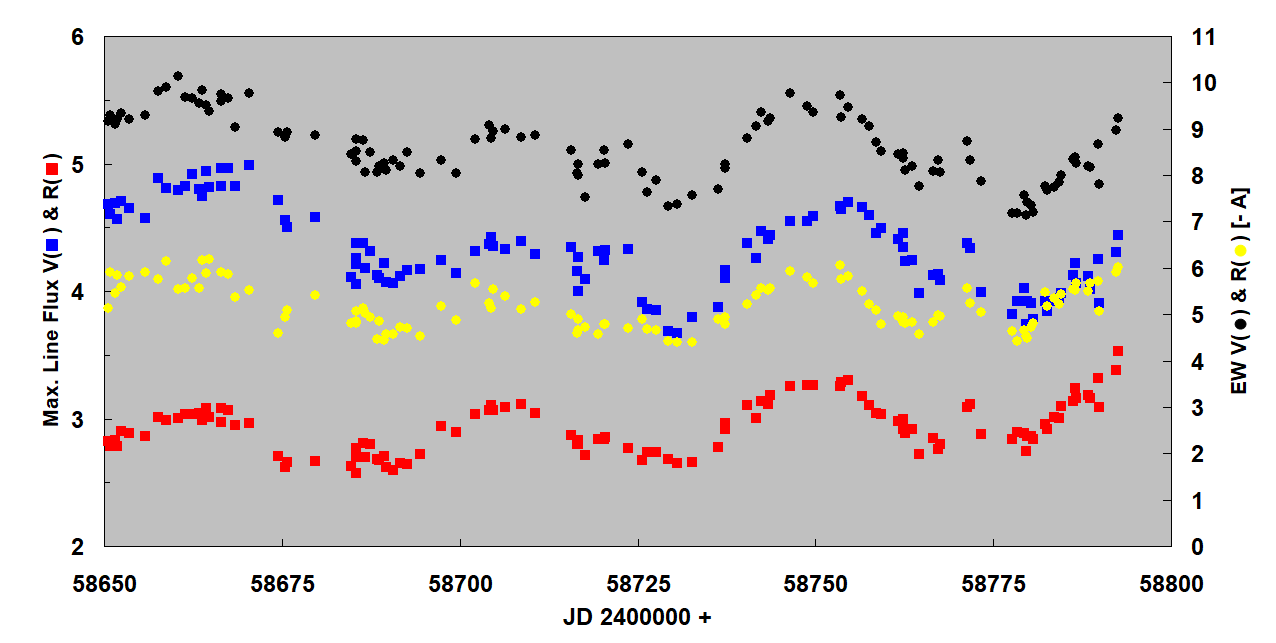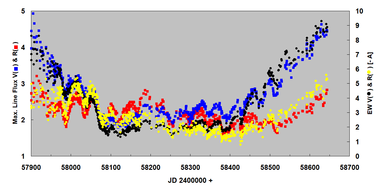 a "nice overview" of the newly-discovered 43 day period of the both emission lobes above (the blue V emission) and underneath (the red R emission) the accretion disk in VV Cep out of eclipse. To draw this nice Figure was only possible on basis of the high spectra cadence of Carl Sawicki, Al Stiewing, Eric Bryssinck, Jack Martin, Juan Guarro and me. Many thanks to them!!