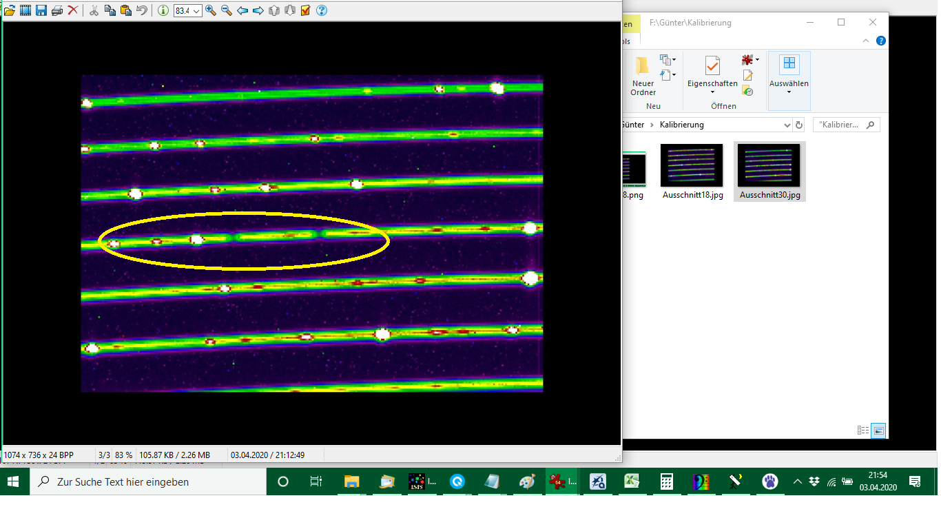 on vois deux spectra 2D consistant d’un spectre d’étoile (alf cam) et un spectre de ThAr superposé. Les distance des lignes de Na et des lignes de ThAr devrait etre le meme dans les deux spectres. Mais on voit la distance de Natrium et de ThAr n’est pas la meme. Quelle pourrait etre la raison. En chacun cas j’ai pris un spectre de ThAr et apres cela un spectre d’étoile.