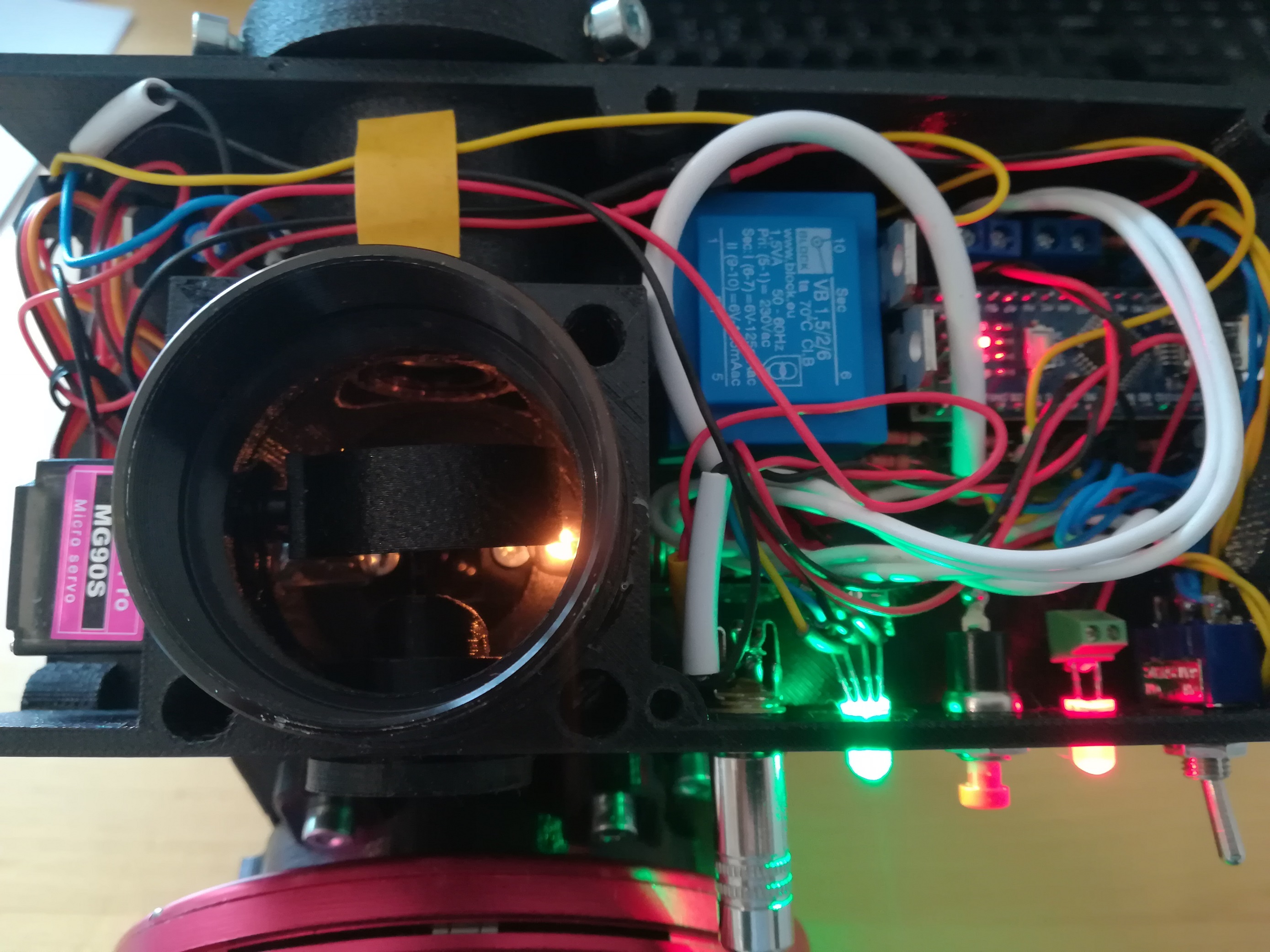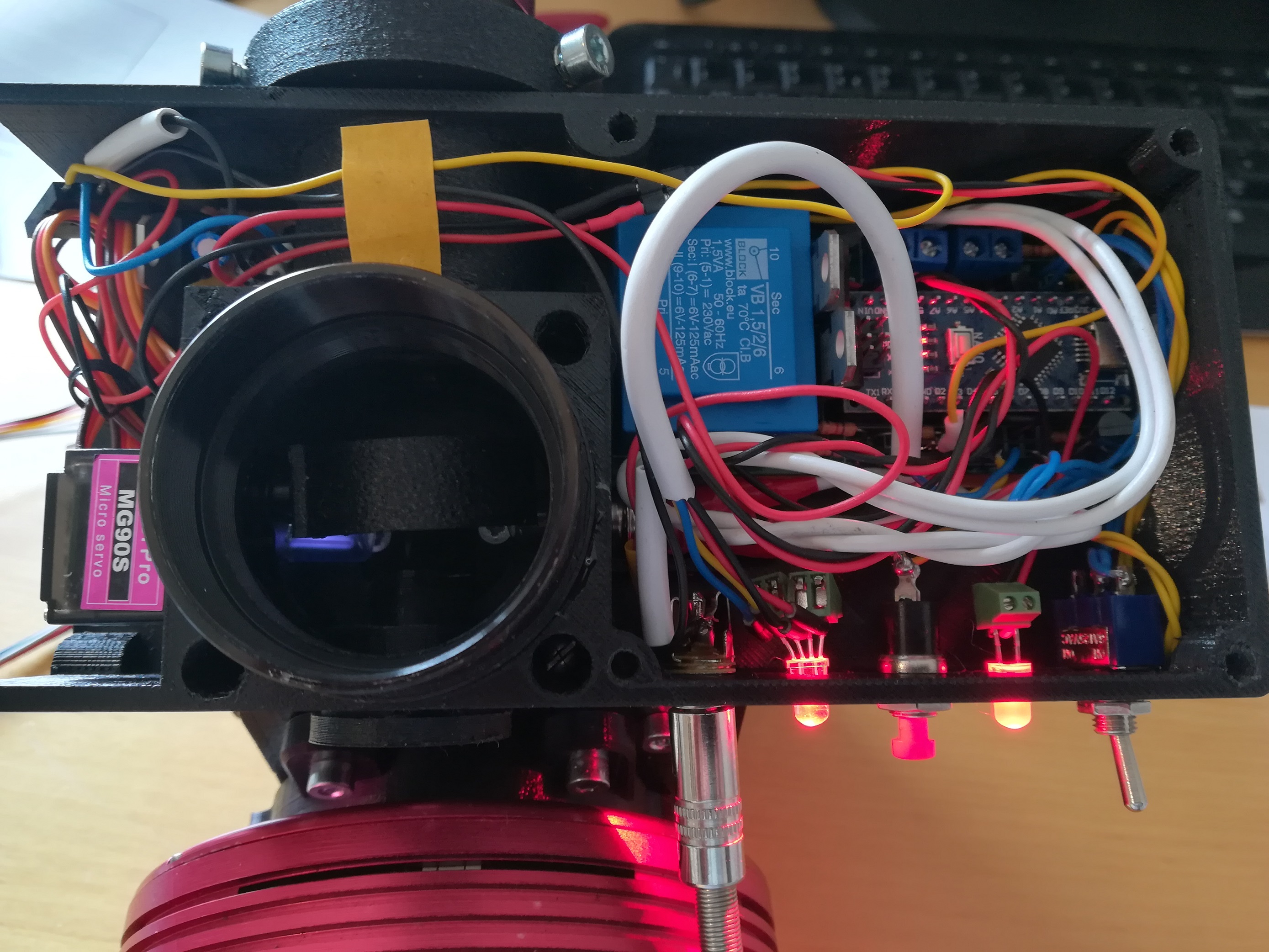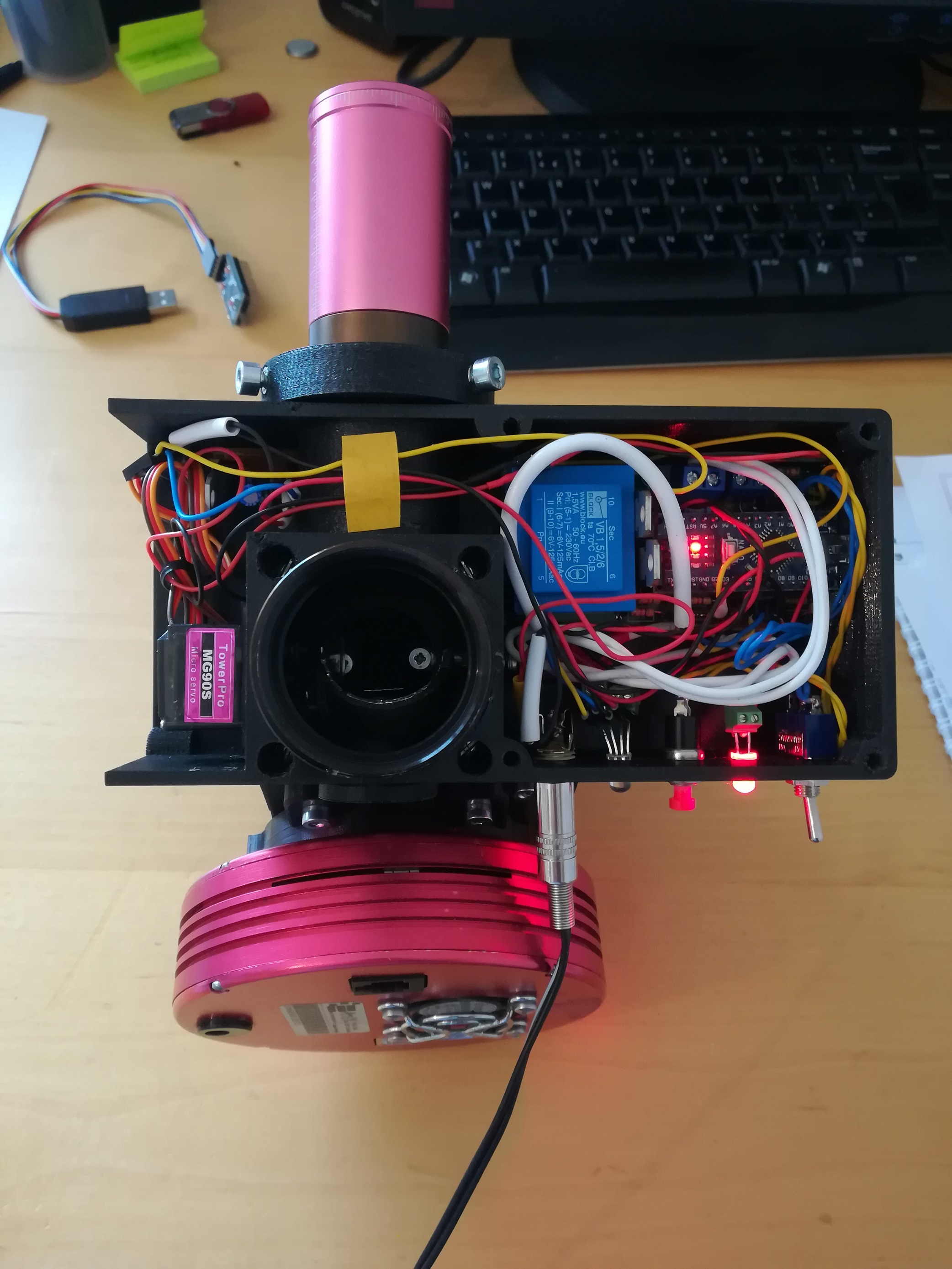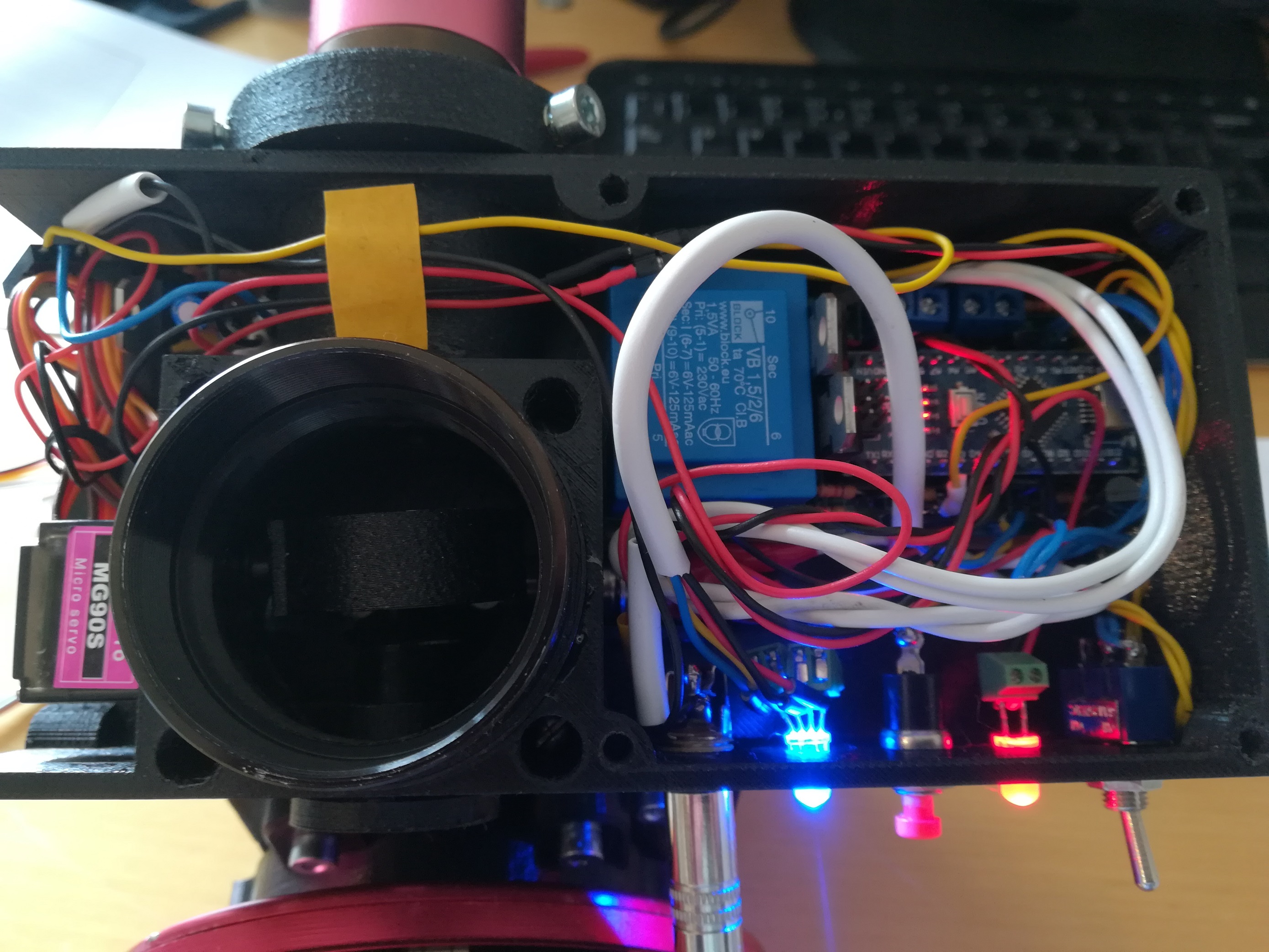 A few mods of course (!). Two x 50mm focal length doublets in the guider for better quality images, a Shelyak photometric slit used instead of the Alpy and a "larger" servo power board for stronger action. Otherwise it's the Nano control board as specified. I've added a 314L camera holder for the UVEX with multiple anchor points.