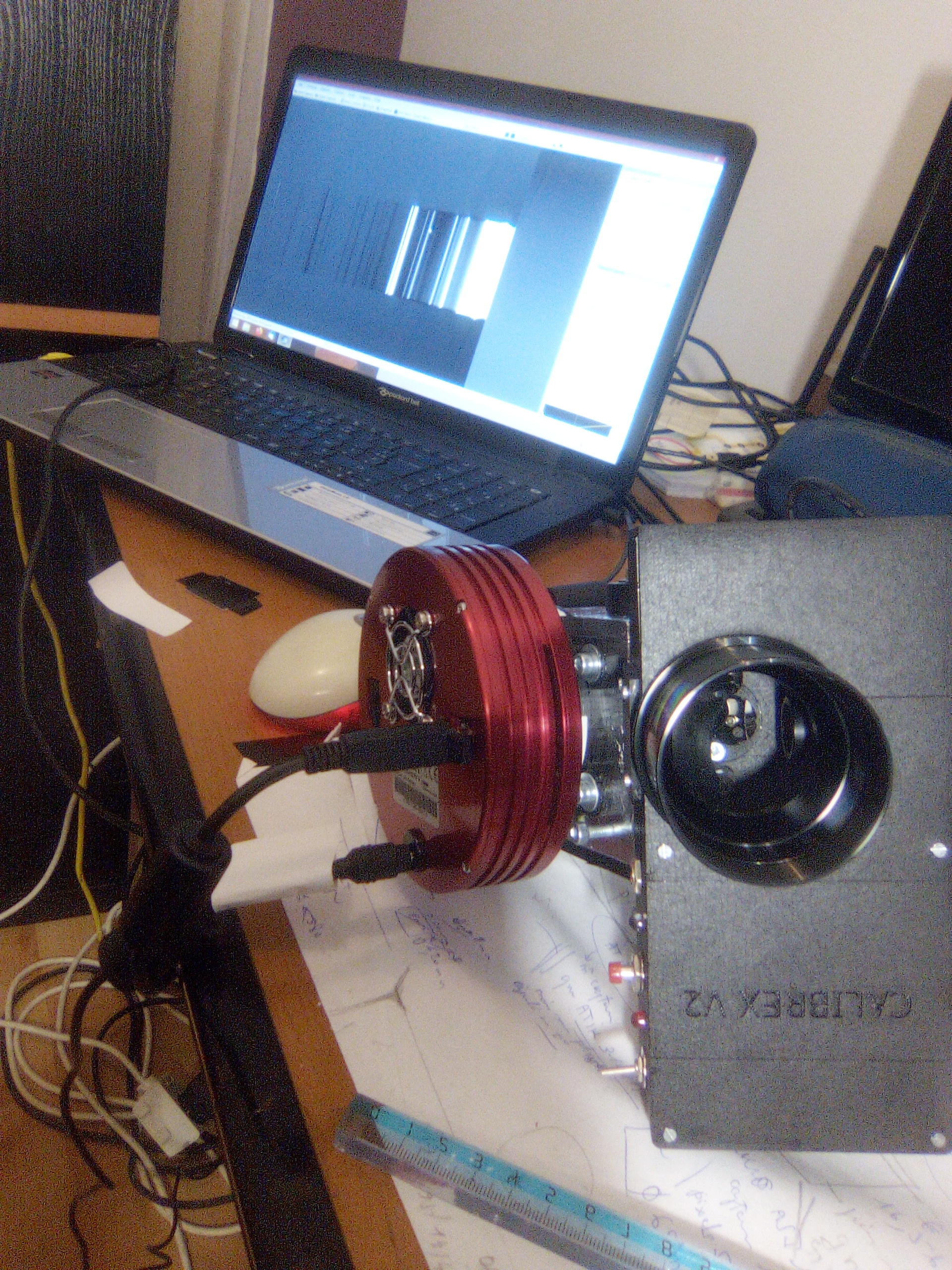 The photos show the calibration unit with the top removed and running the sequence of Wavelength, Flat and Dark/Bias frames.