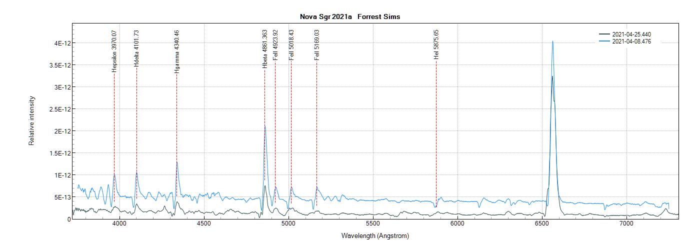 Here is an update on Nova Sgr 2021a from last night. The plot includes my prior observation from 2021-04-08 for comparison. Both spectra are flux calibrated which explains the offset in the graph. I recorded the V magnitude at 11.18 last night and the previous 2021-04-08 observation had it at V mag 9.80.