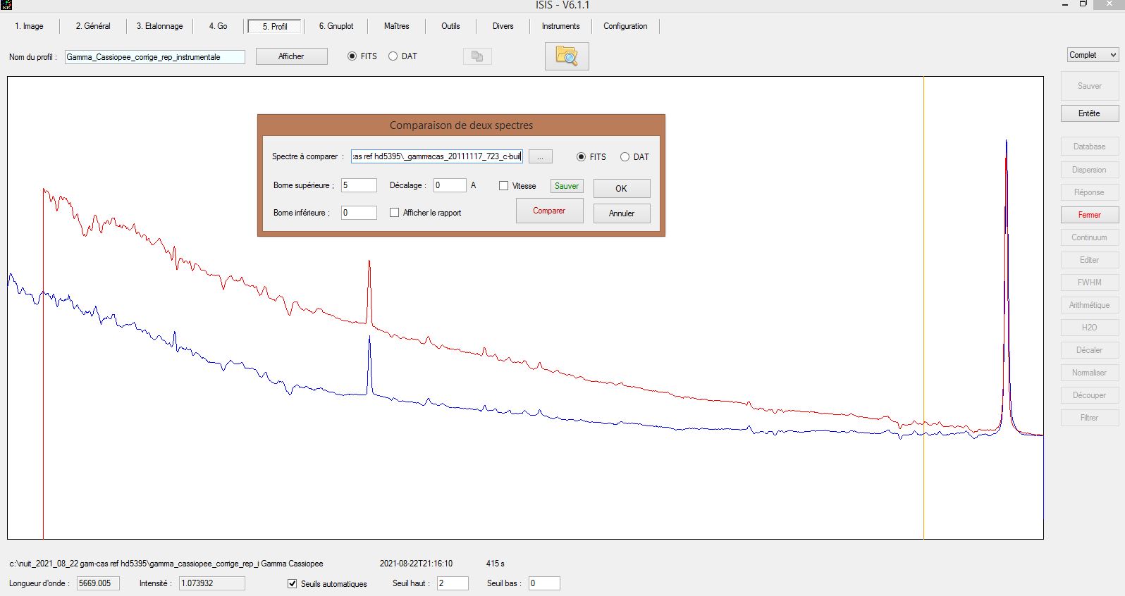 - On procède ensuite au traitement avec ISIS en commencent par l'étoile de référence. Puis on compare l'étoile de ref ainsi réalisé avec l'étoile de ref de la database ISIS.