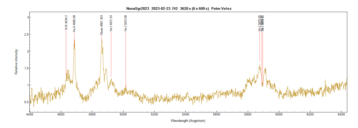 The best quality spectrum I have is for 23 February 2023. I've marked the most prominent lines. Resolution is around 1200. Taken with a UVEX mounted on a Planewave CDK 12.5. I'm surprised at the strength of the He II line - perhaps I have misidentified it so corrections and comments are welcome.