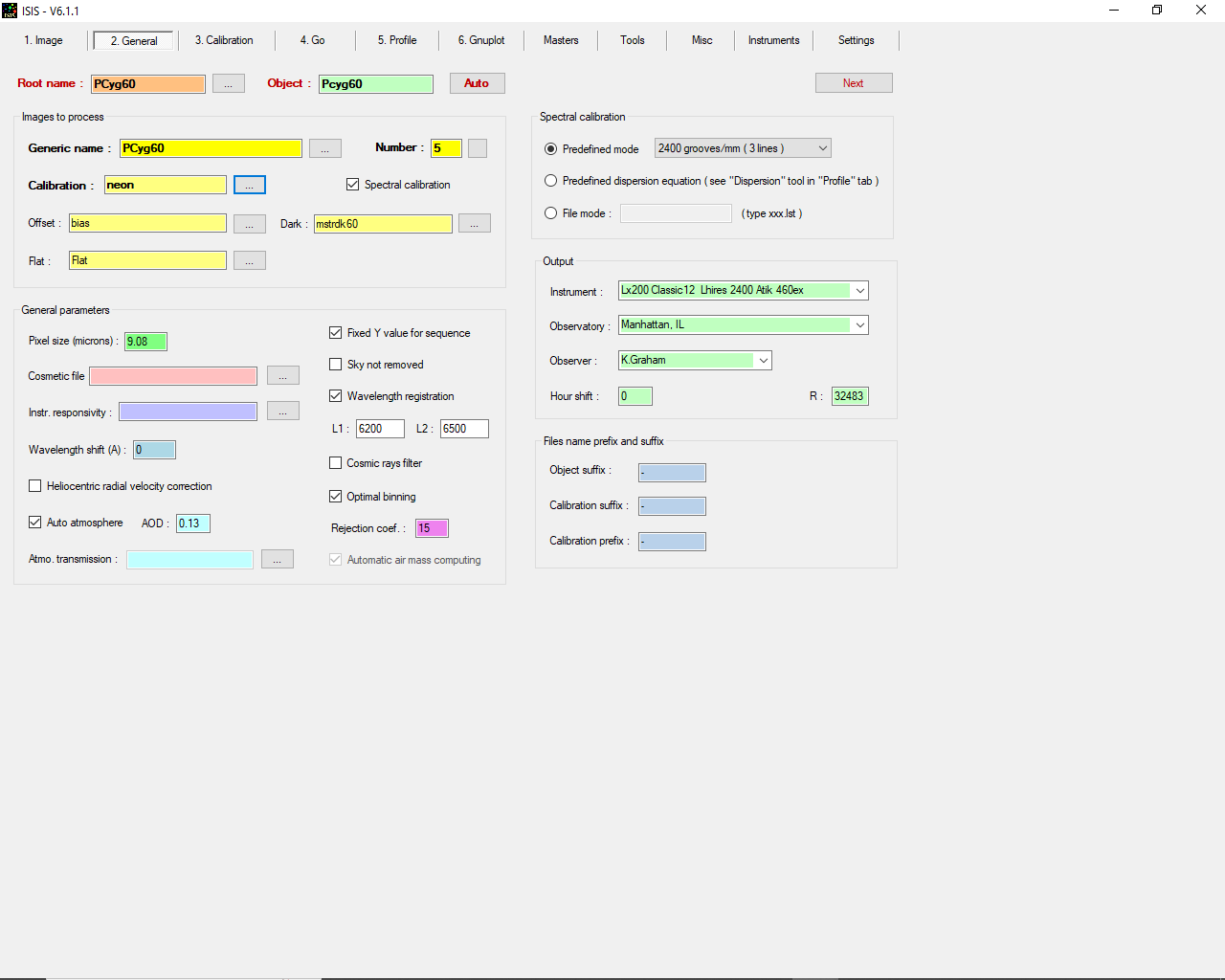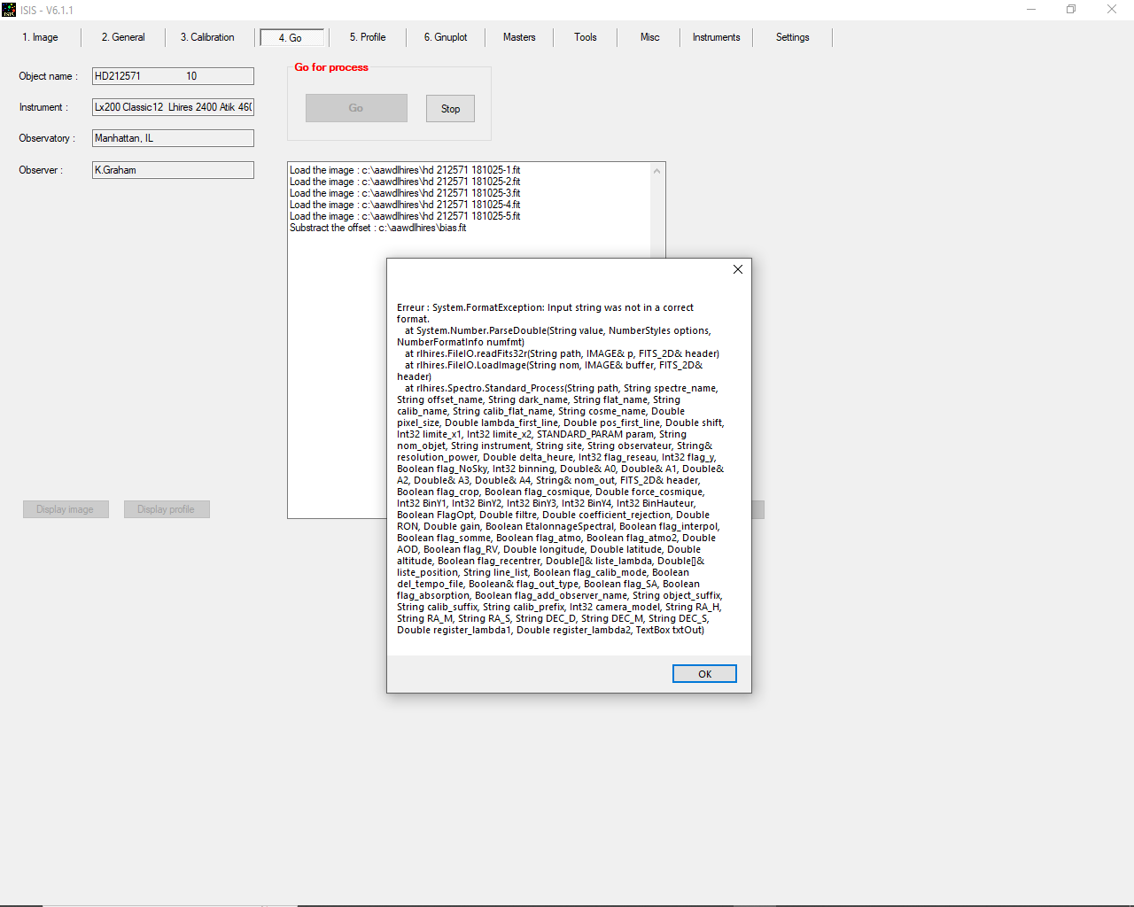 I have been away from spectroscopy for a few years and am now getting back into it. I went out last night and took some specs of P Cyg and am now trying to process them. I took darks, flats. and bias frames (8 each), created master frames for all, and placed them into a working directory.. When I tried to process them in ISIS, I keep getting an error message that I do not understand. I have attached screenshots of both the error message and the information I put in the ISIS General tab. Note how I did not include a cosme file, so I did attempt to create one in the ISIS Masters tab.from a master dark but got a similar error message telling me that the input string is not in the correct format.