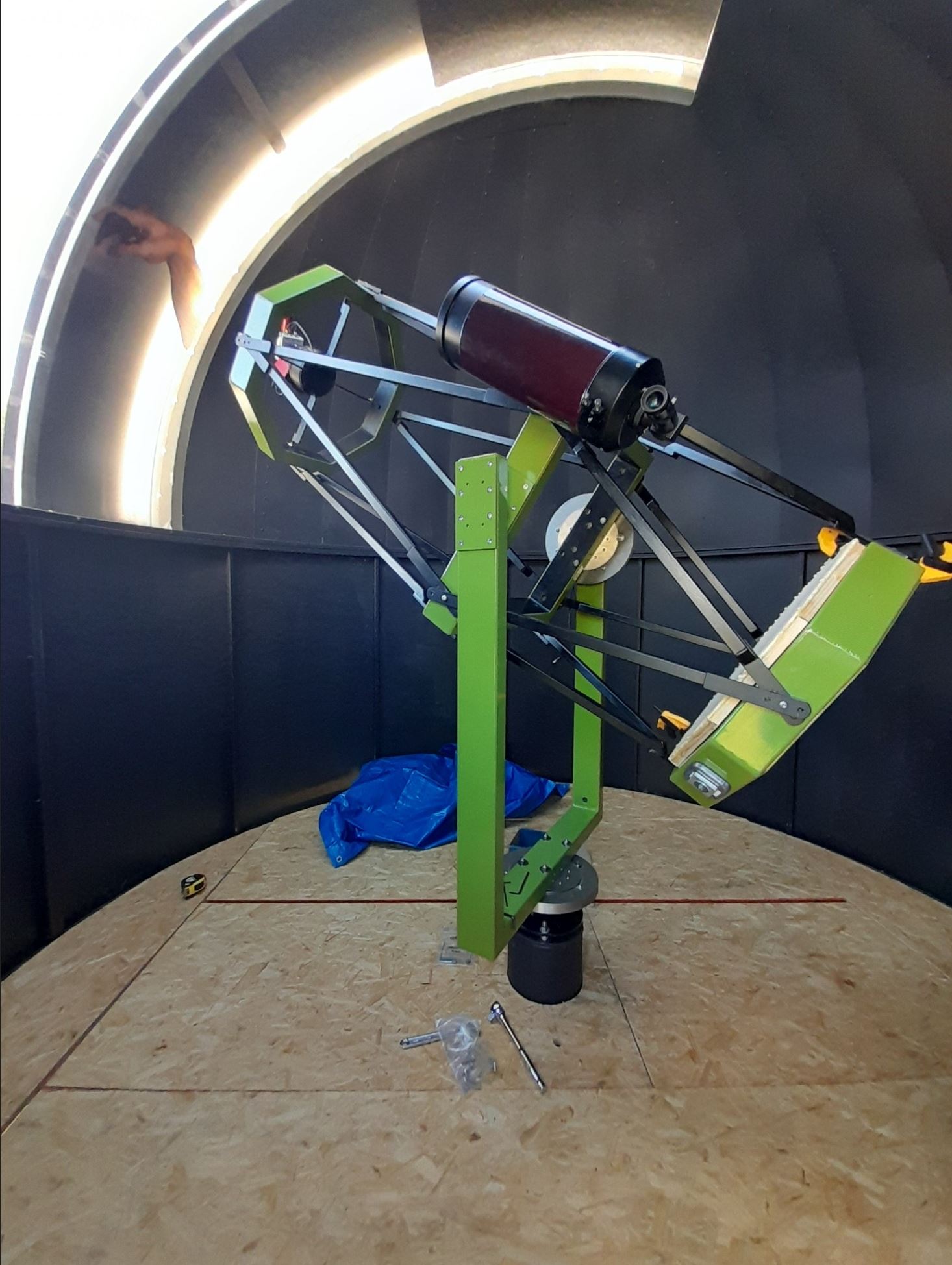 The telescope is a 50cm f/4 prime focus design - the simplest possible telescope - using a lightweight mirror from Teleskop Express. Prime focus means no secondary, so it's one less surface to lose photons, attract condensation and to deal with in collimation. The truss assembly, spider, mirror mount and alt-az fork were made by a local engineering firm to my specifications using friction drives taken from a Mesu mount (which perform impeccably): http://www.mesu-optics.nl/mesu200_en.html The focuser and rotator are from PrimaLuce Lab.