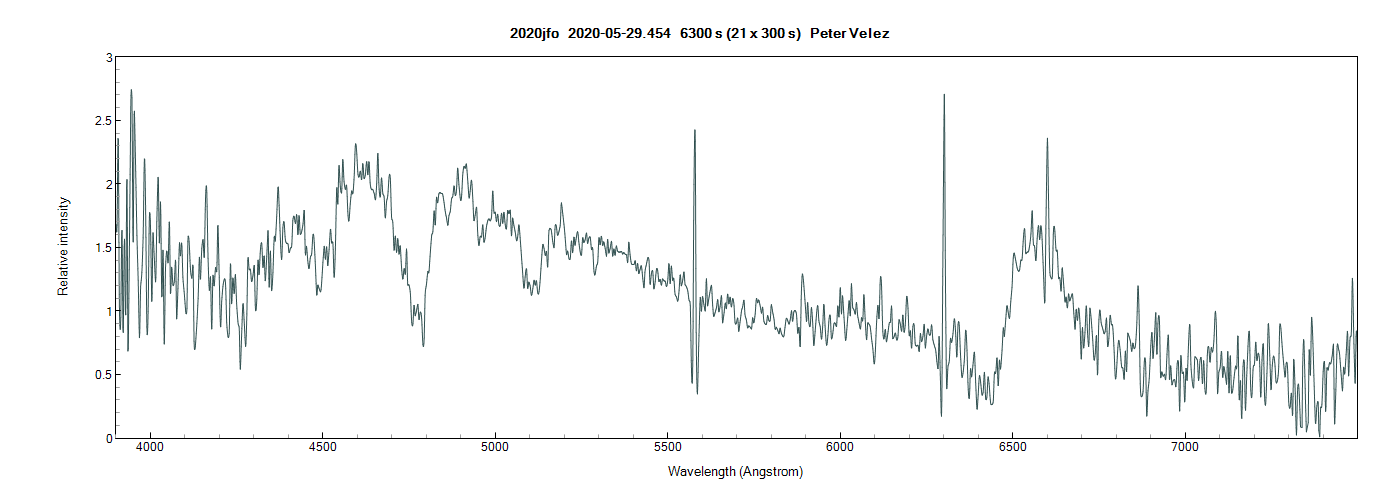 At this early stage I'm pleased with the result. There are a couple of spurious spikes though the emission at around 6600 is genuine. I'm keen to learn how to identify particular absorption features to determine the velocity of the ejecta from the spectrum. If anyone can point me towards a useful publication or site for this I'd be grateful.