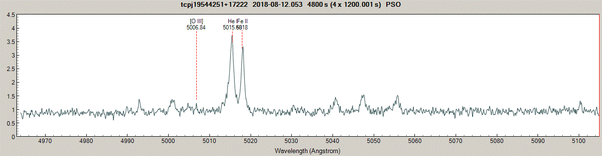 The detail around He I 5016 (unresolved pair with Fe II 5018) seems a little different than your. The signal is poor but feel like there is something near the oxygen line wavelength. To be explored...