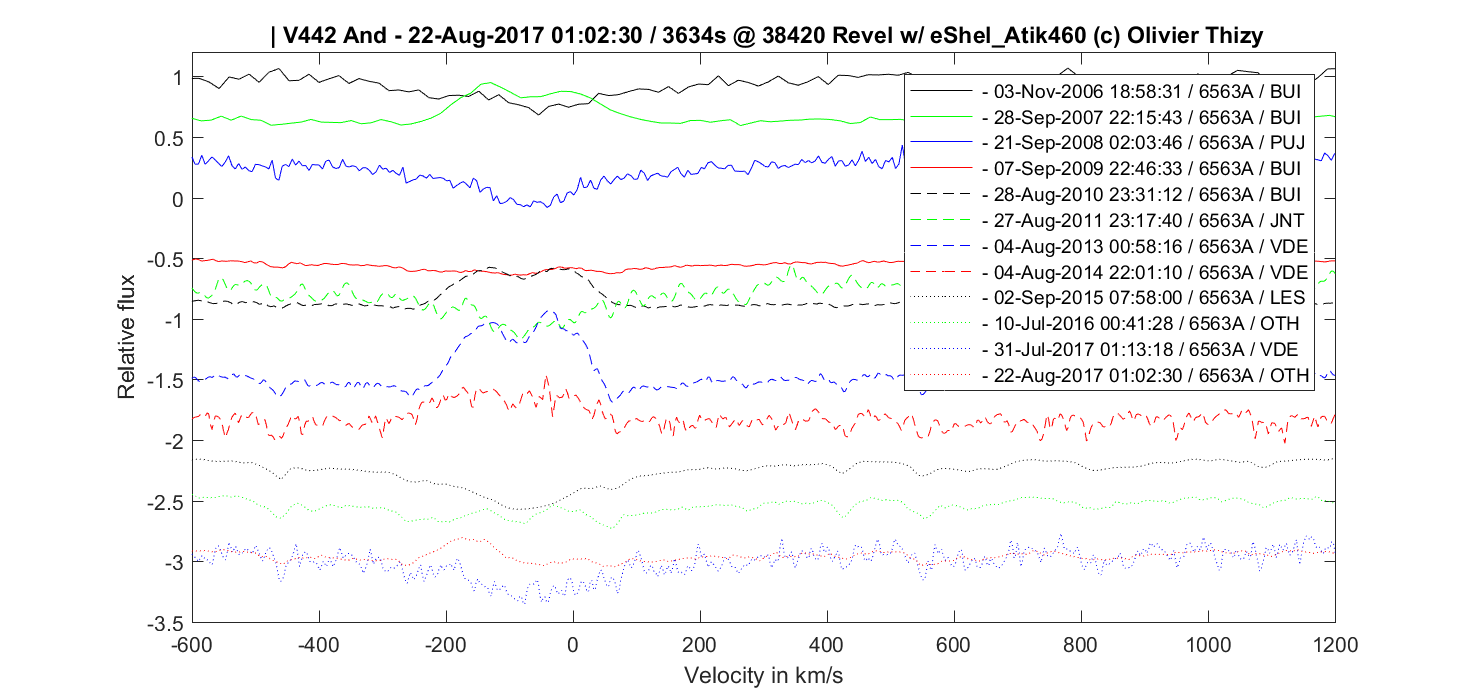 A look at previous years show that V442 And is a very active Be star with period of quiet and period of outbursts. The required observation period in ARASBeAm is set at 30 days so a continuous observation of this target seems a good idea. There are 97 spectra of this star in ARASBeAm/BeSS database. Here is a graph with a spectrum taken about every year, showing activity in 2007, 2010, 2013, 2014, 2016 and now 2017:
