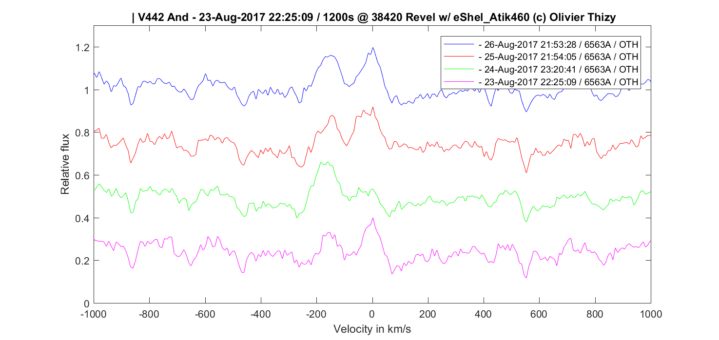 The nice thing about ARAS is that this is a network of observers and when weather is cloudy on one location, there is usually another location with clear sky. Thanks to Christian Buil that observed the bight after the outburst announcement and Joan Guarro Flo whic observed last night, we have data almost every 24h on V442 And. And spectra do show changes night after night - a very interesting target for the moment so do not hesitate to observe it (and upload spectra on BeSS).
