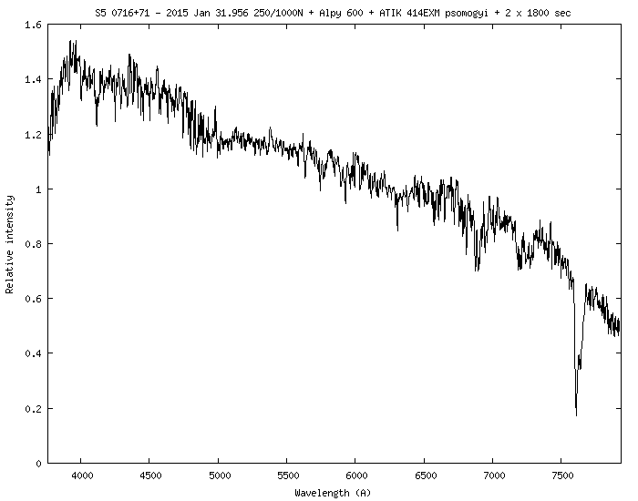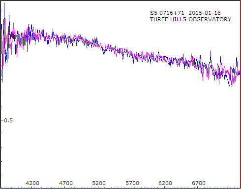Here's a spectrum of S5 0716+714 taken with a LISA and 18x5min exposures. I used the same MILES reference star as Robin. I've flux-calibrated the spectrum using B and V mag measurements of the object taken at the same time which gave V=12.54 and (B-V)=0.47.
