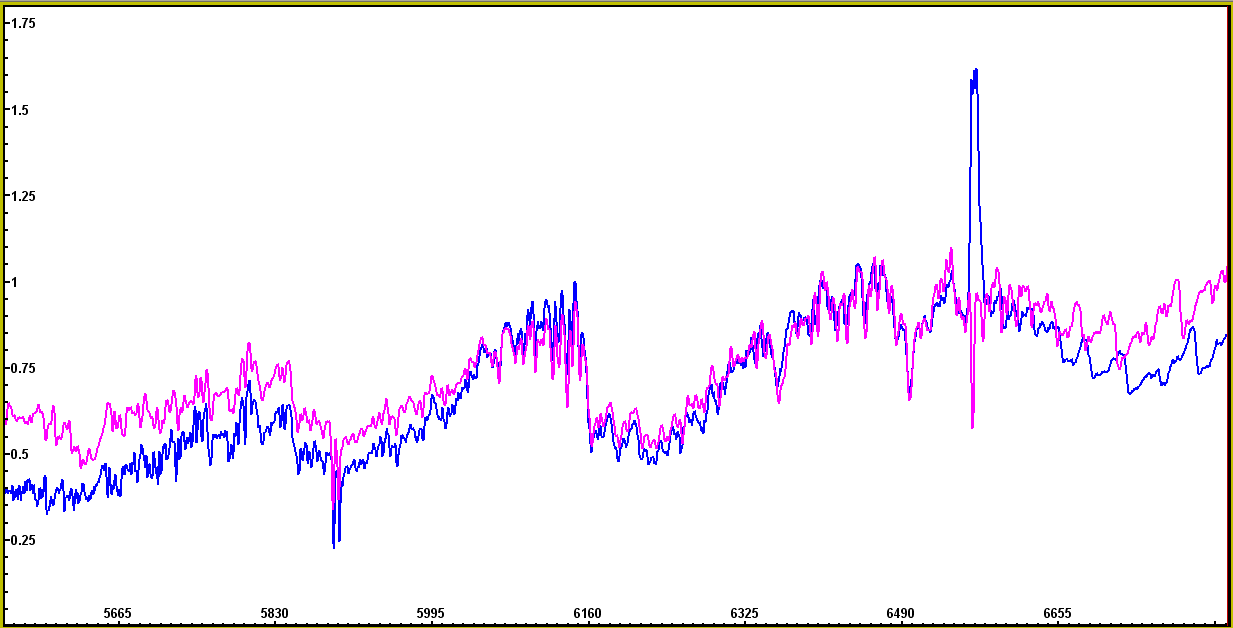 In addition you can see that the Halpha emission shows a strange and unrealistic profile which is based in the too low spectral resolution. With other words: seriously EW determinations in such a sort of spectra are less to not meaningful.