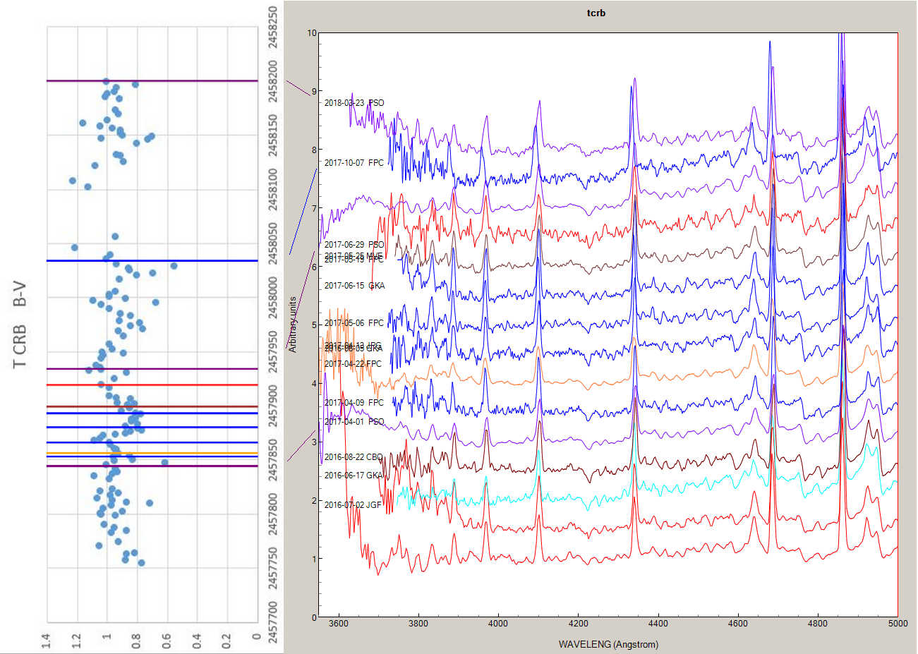 Reusing your B-V index graph, I've generated now colored serie (all rectified to 4149 - 4254 A), each color assigned to an observer: