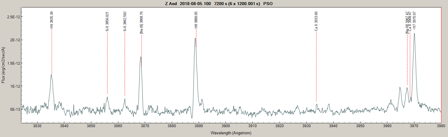 By chance, I've also visited this object in the near-UV (12" Newton, LHires 2400/mm, 35 micron slit, R~5500 average) on the weekend: (Flux calibrated with 2-stars method on 15 And (miles), using the wide slit.)