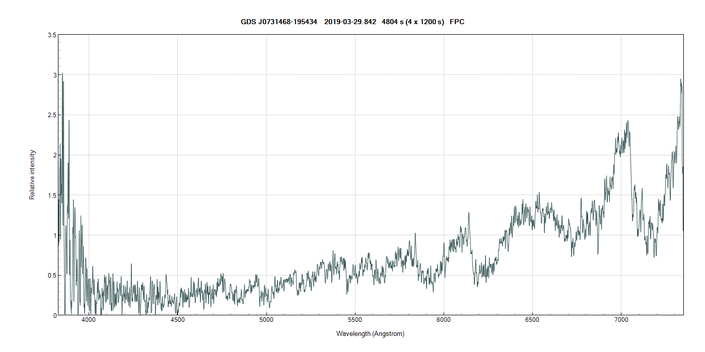 here is a recent spectrum of the suspected symbiotic GDS J0731468-195434. No emission lines have been detected, the signal is low but enough to discard the presence of medium or strong emisison bands.