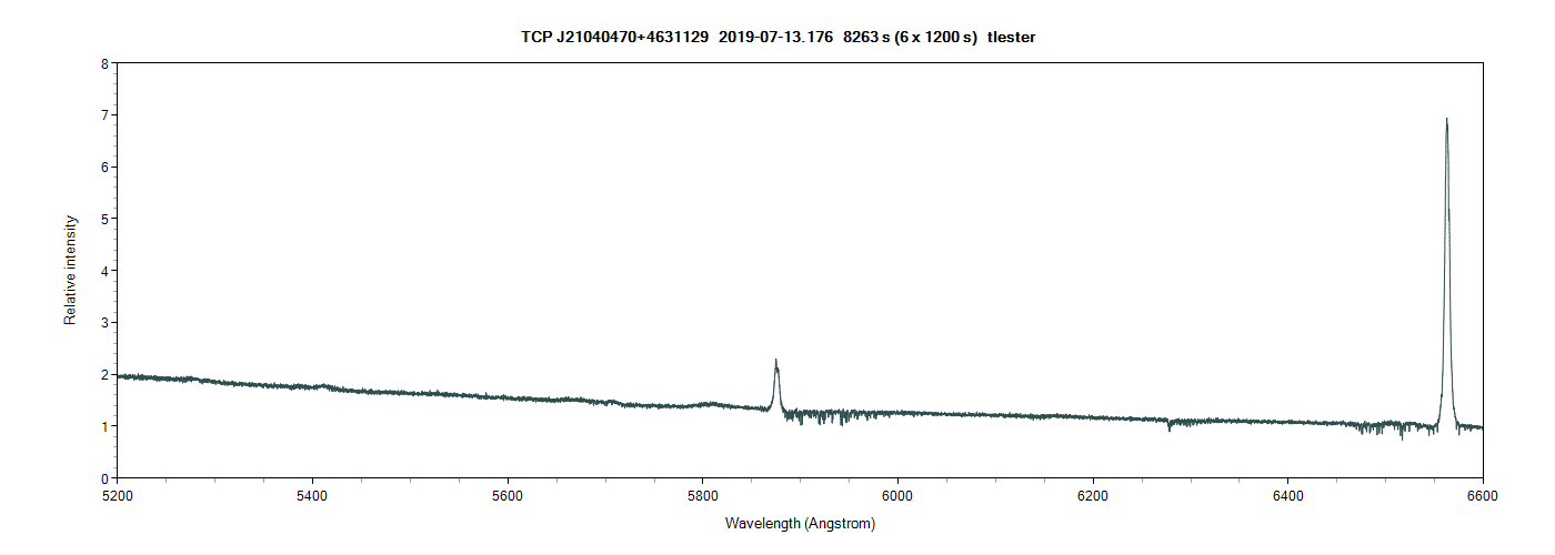 Spectrum of TCP J21040470+4631129 taken on 13th July with a LISA spectroscope (R=1100) on a C11 and flux calibrated with concurrently measured mean magnitude V=9.14, B-V=-0.23.