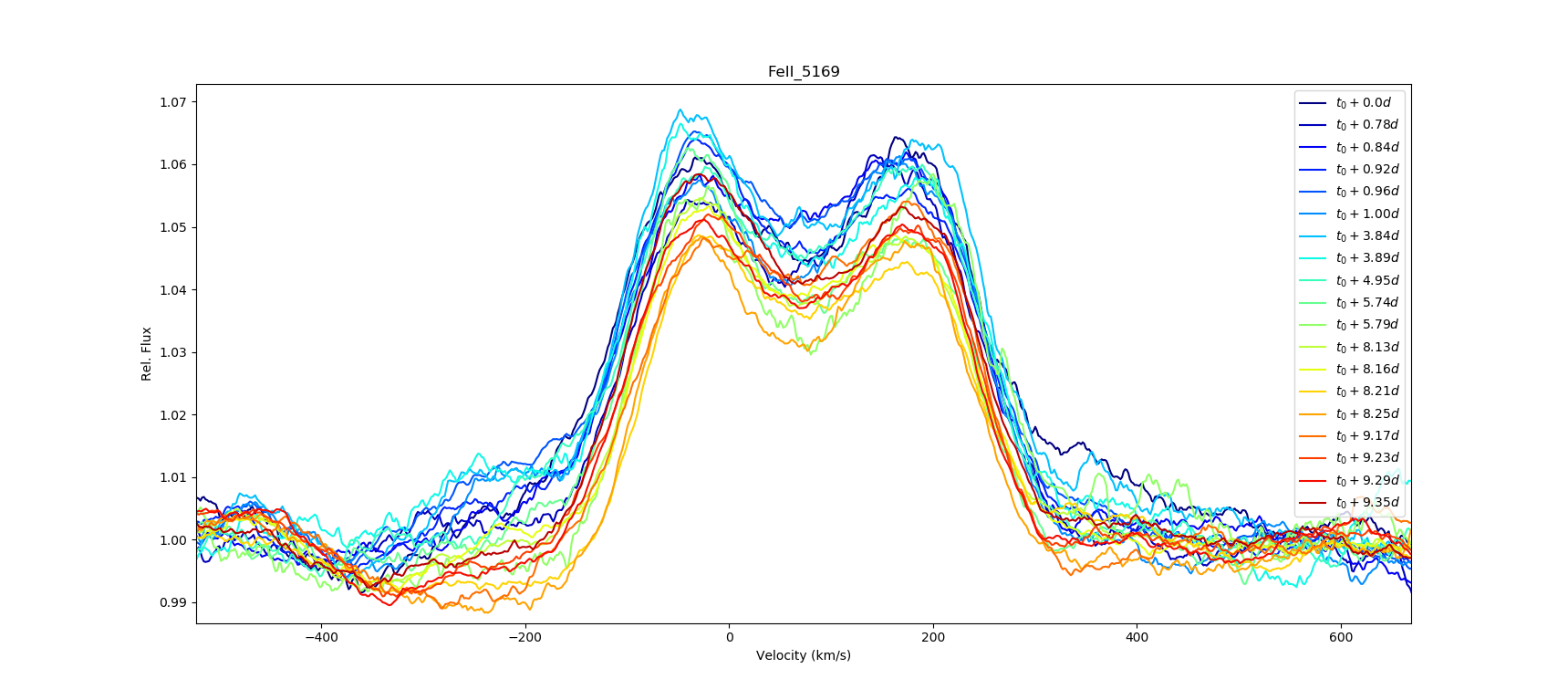Then the rest are some choice lines from the spectra. The large Halpha plot has an offset that corresponds to the spacing in time betweeen observations, while the rest are simply all the spectra stacked with no offset.