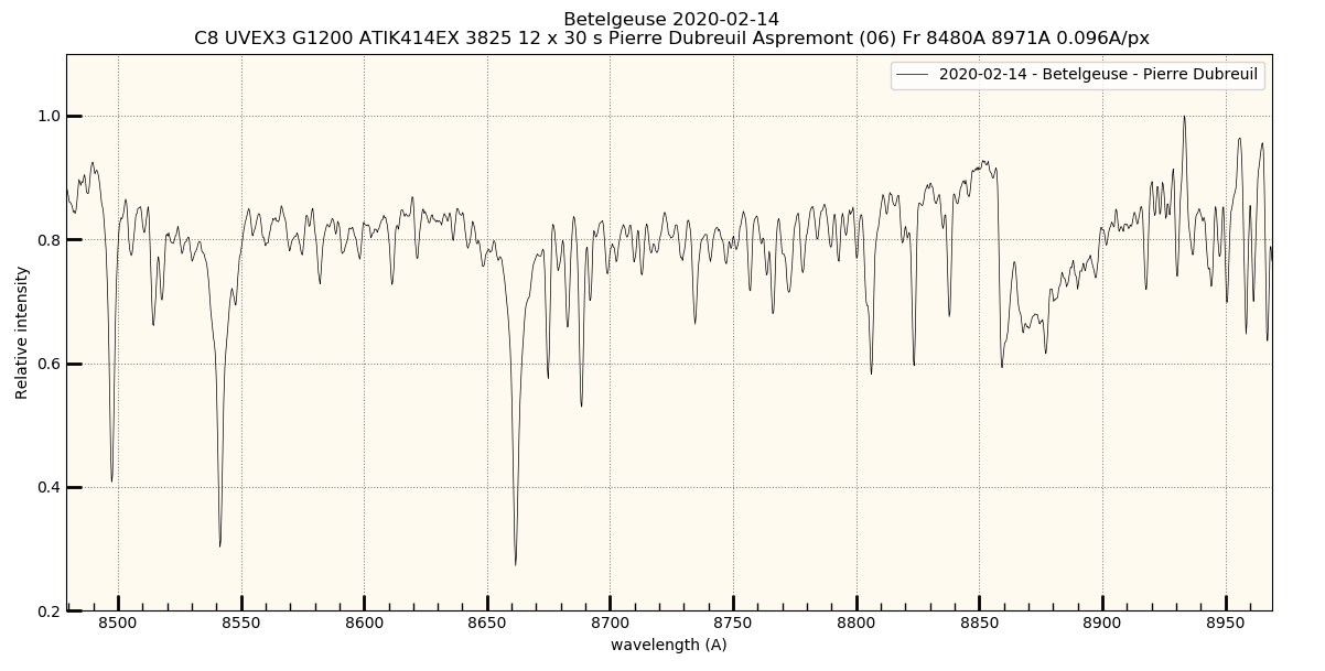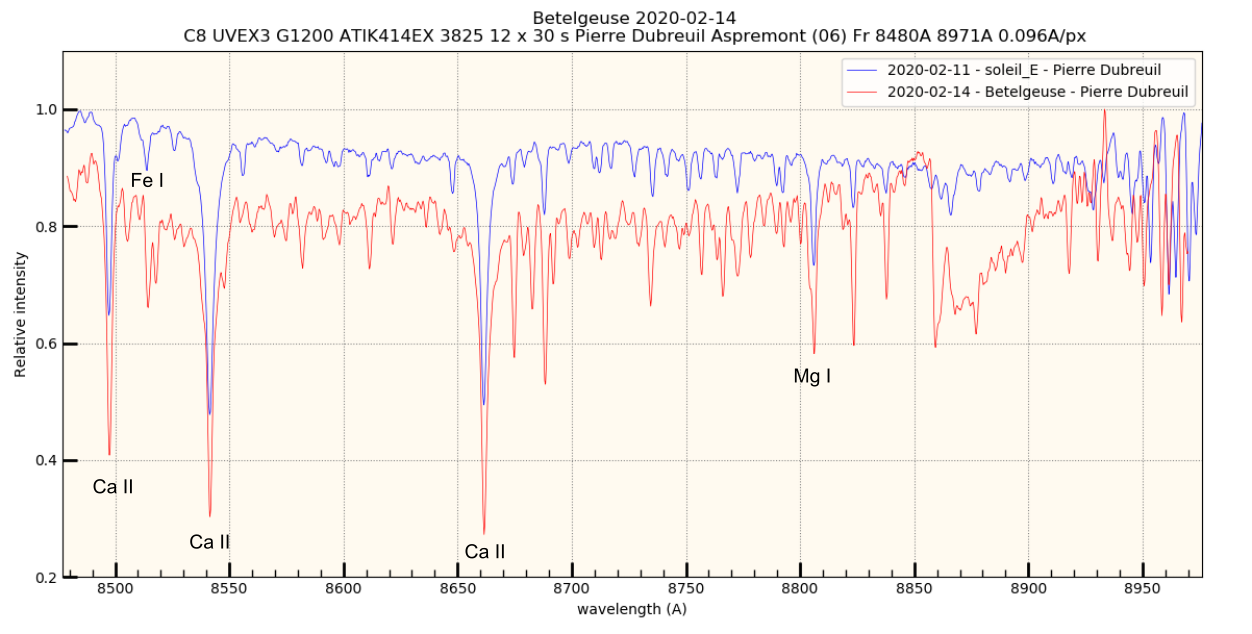 Après quelques essais sur le Soleil dans le proche IR, hier soir j'ai choisi une zone avec raies Ca II pour Betelgeuse.