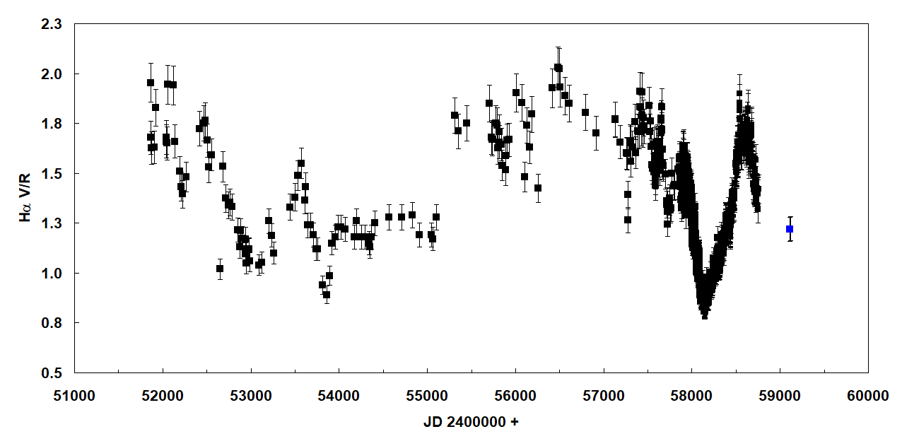 observations of VV Cep are still relevant since the Halpha EW and the ratio V/R are showing a strong dependence on the orbital phase of the companion (attachments). At present we are in phase 0.78 (periastron = phase 1.0)