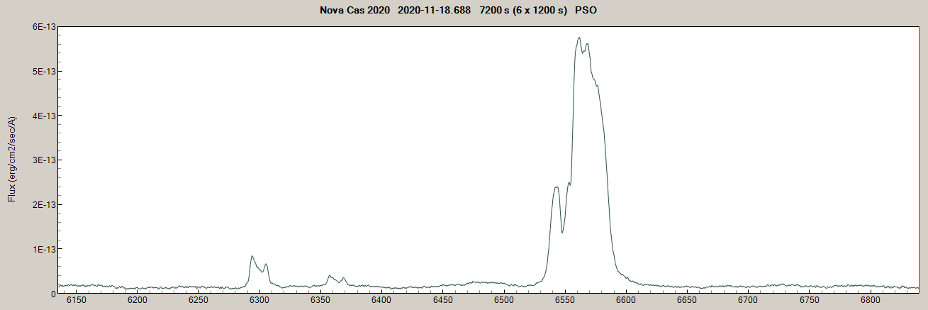 And here is the resultant spectrum of (9) 900 second exposures. Halpha and Hbeta are still detectable as well as [O I] 6300Å and [O I]6364Å although they both appear shifted blueward around 5Å.