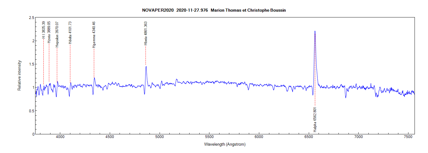 We obtained the following spectrum of nova Per 2020 the 27th of November at 22 h 25 TU with an Alpy 600 (resolution of 506, JJ = 2459181.4758) and an acquisition time of 60 min :
