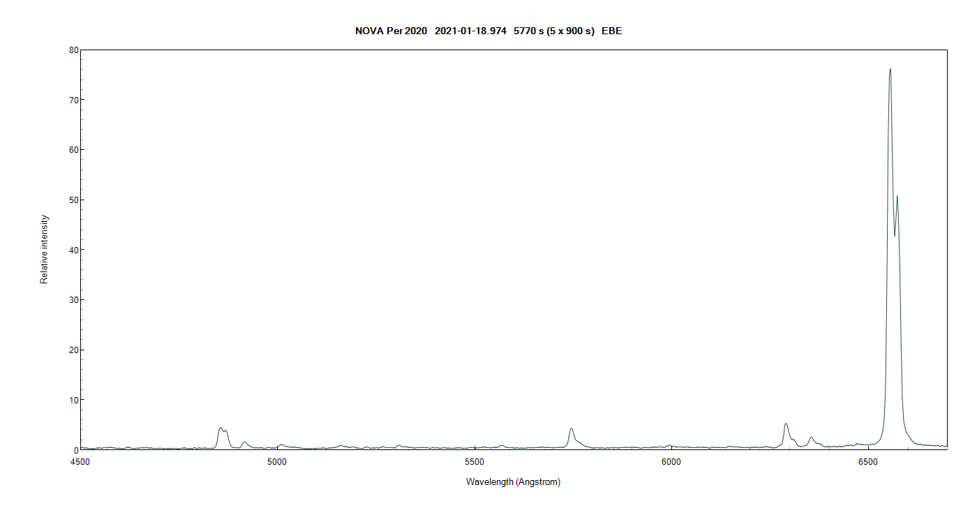 Here is my Alpy spectrum from 25th January. It is very noisy because this object is at magnitude 15.5 now. Most of the emission lines appear to have twin peaks, or look as if a higher resolution spectrum would show twin peaks. What could be the cause of this phenomenon?