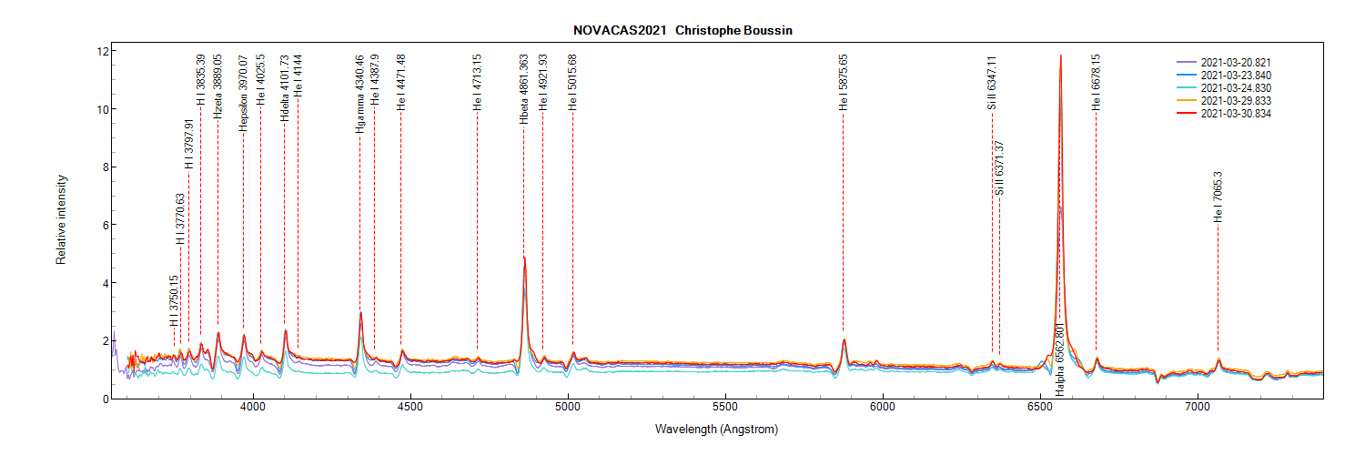 Evolution of the Nova Cas 2021 from March 20 to 30 with the addition of the identification of the Si II lines (see previous post by François Teyssier) :