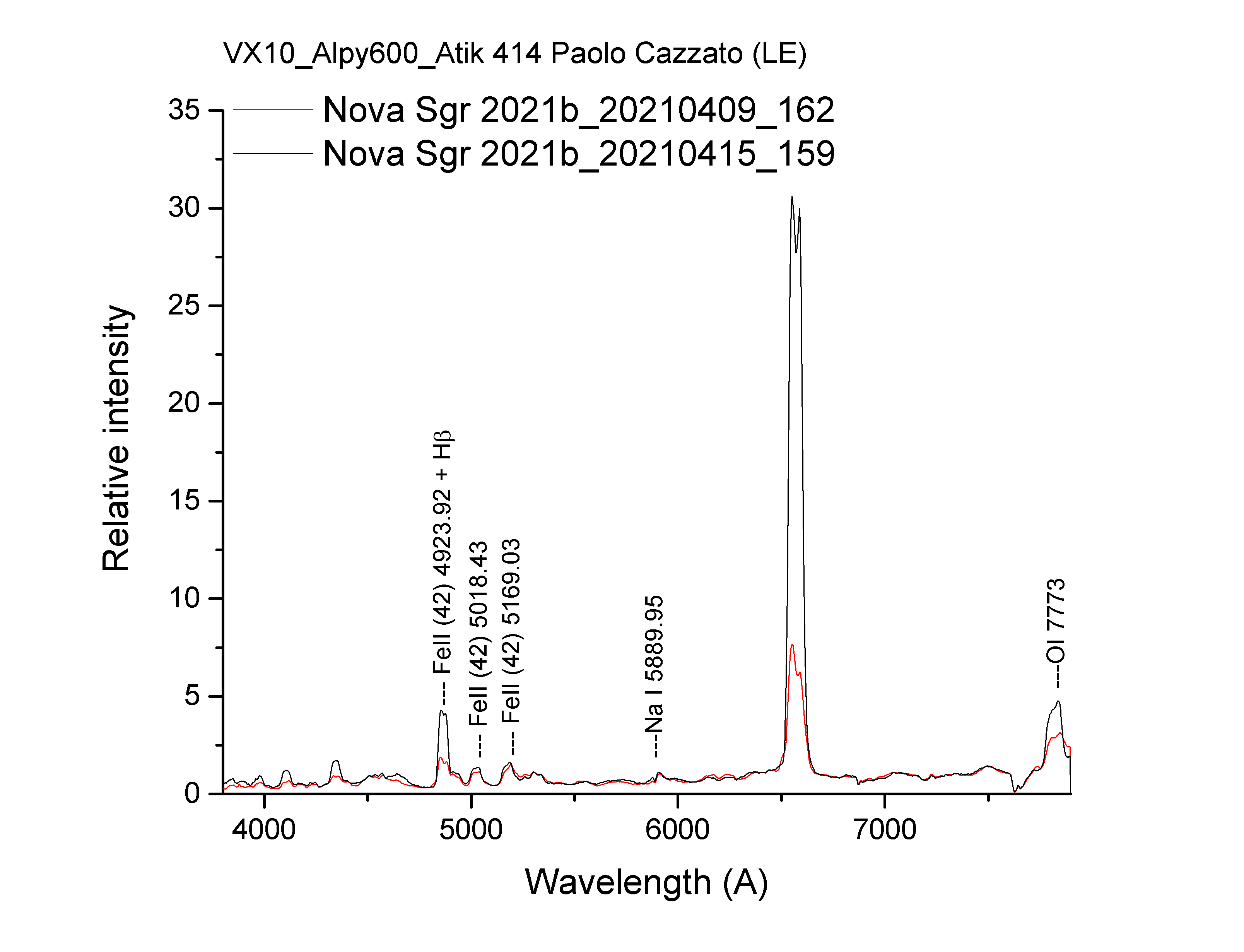 here my comparison at low resolution of this Nova taken from 3800A to 7900A. At low resolution I noticed an incrase of the basic lines and a splitting of the h alpha line. I also noticed an incrise of the OI (?) line at the extreme end of the spectrum. Would it be possible an overlap of the Mg line at 7890A in your opinion?