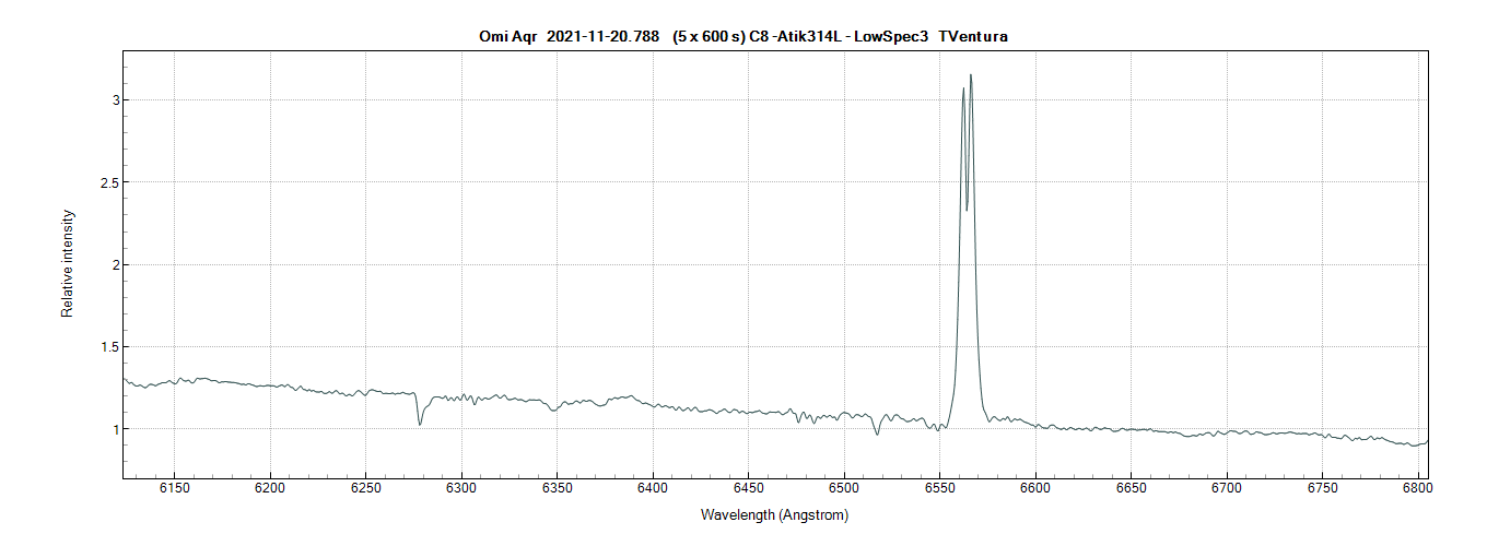 After having properly set up the spectroscope and having changed the lattice from 600 to 1200, I enjoyed processing the spectrum of the star Omi Aqr. The processed area is that of the hydrogen Halfa. The one on which professionals, as far as I know, study the most.