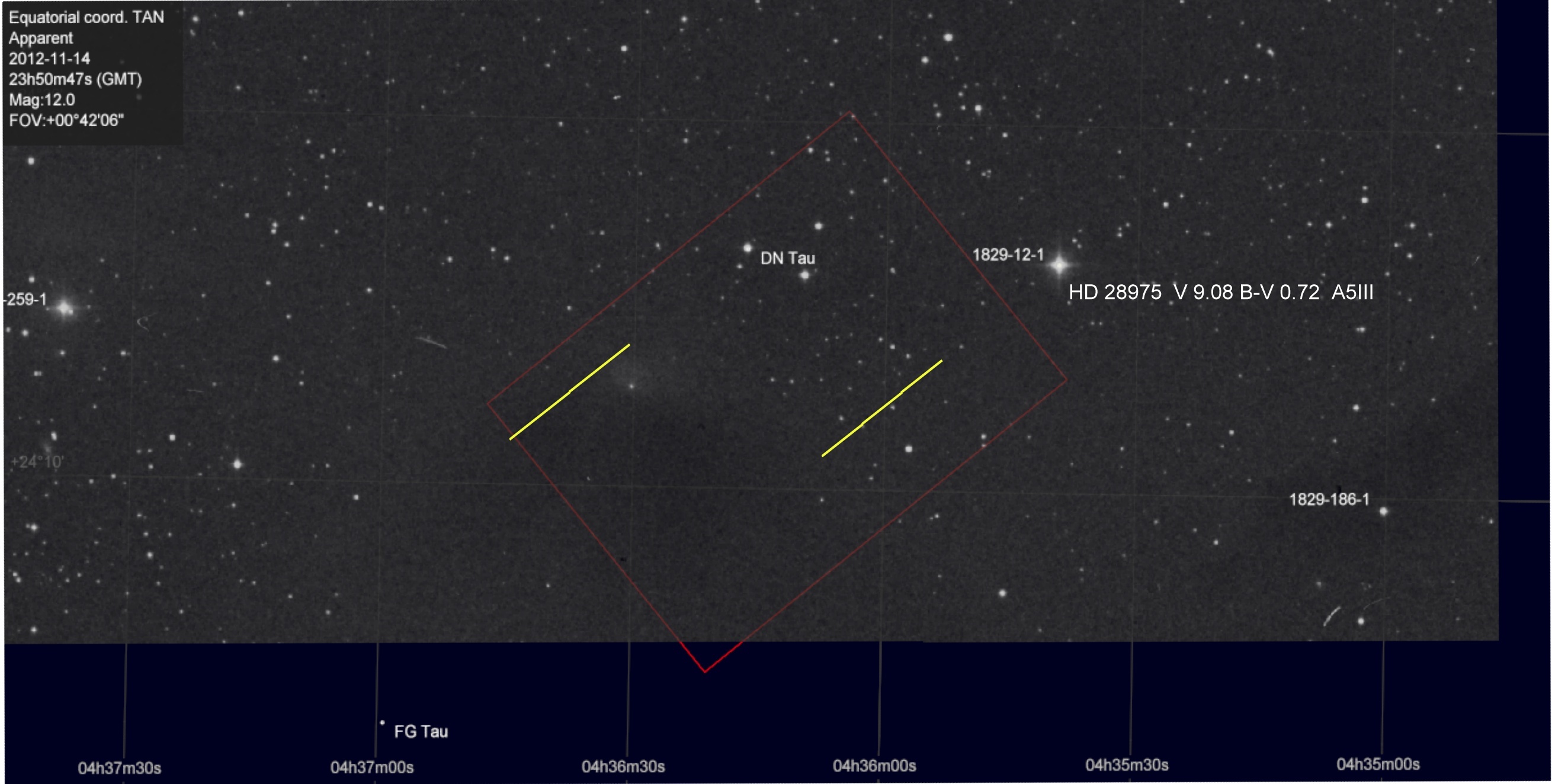 I am working with him to identify potential reference stars and here are some preliminary fields to try based on my setup of C11 at f6.3, SA100 and ATK16IC-S at 14A/pixel. The yellow lines show where the spectra from 3500-7200 would fall. (The suitability of reference star for DR Tau is to yet to be confirmed)