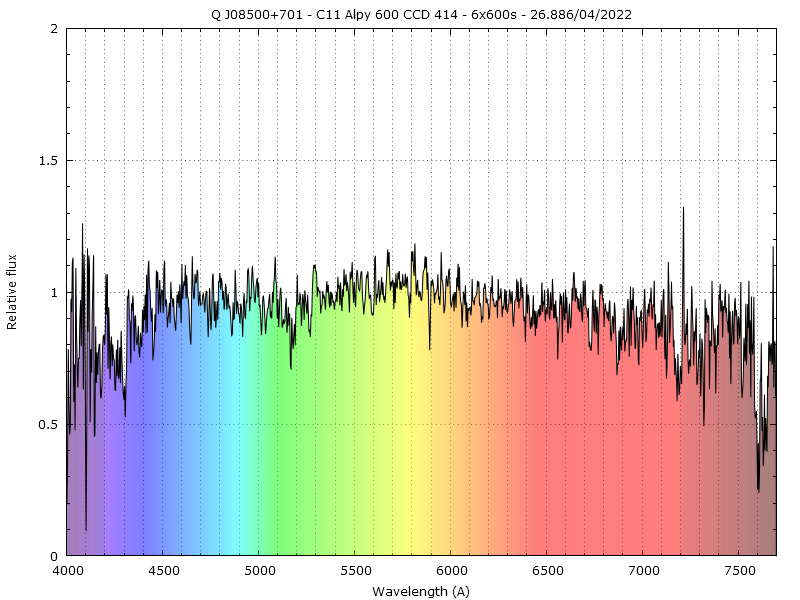 Le spectre ne ressemble pas à celui d'un quasar, plutôt à une étoile + la galaxie ? On peut jouer avec les z du quasar et de la galaxie pour identifier des raies, mais ça me semble curieux quand même pour un objet à Rmag 11. Qu'en pensez vous ?
