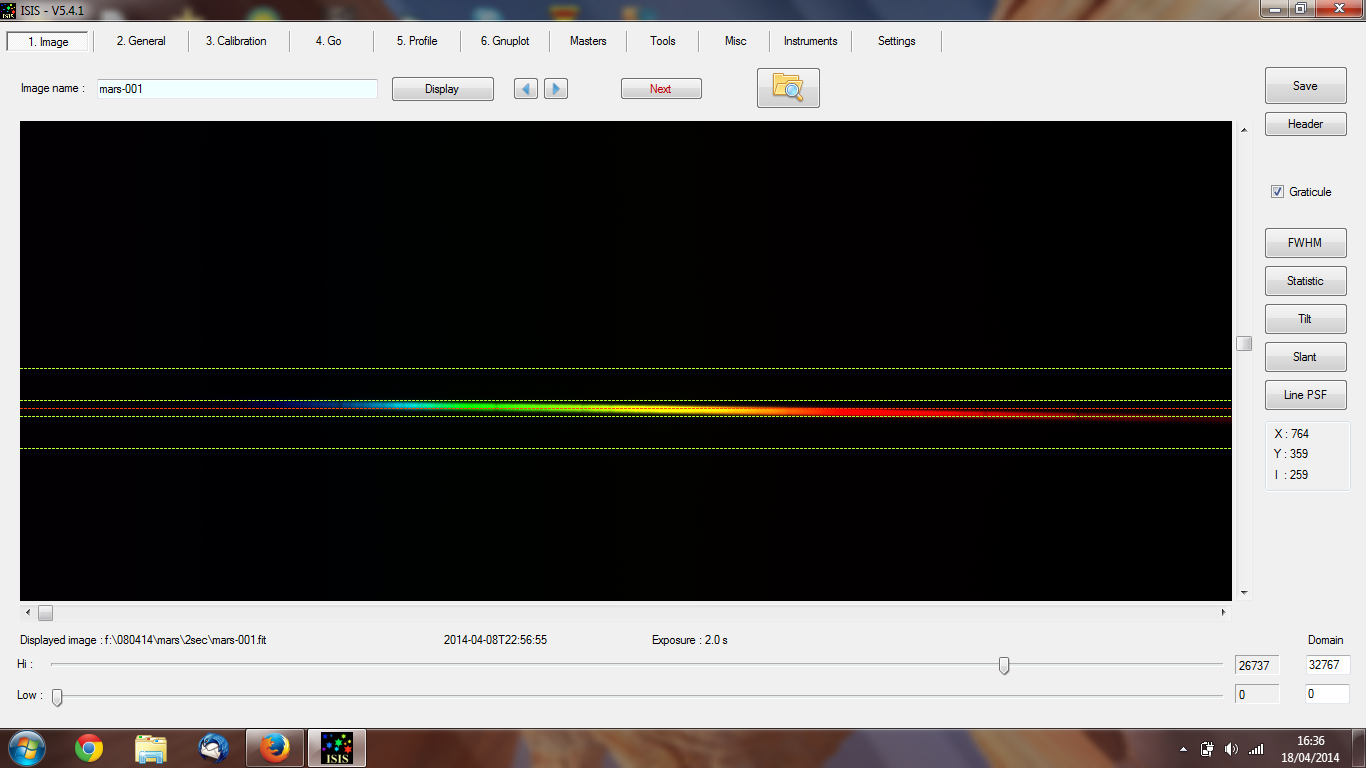 I then measure the tilt on the spectrum and the smile/slant on a lamp or sky background line. ISIS picks these figures up and does all the necessary corrections when you press "go" producing a fully corrected image and a binned spectrum profile.