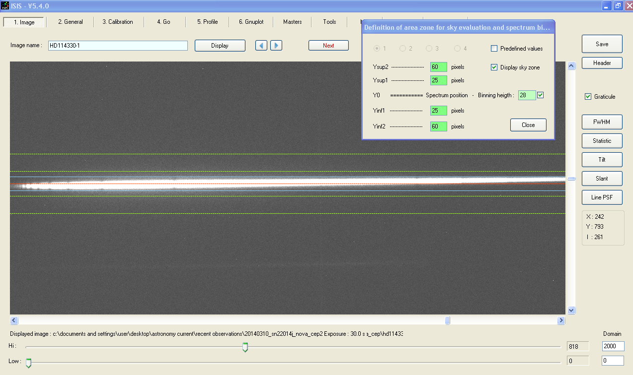 I cannot see the binning zone in your image (there should be blue limit lines either side of the red dotted centre line). Is the inner sky zone the same as the binning limits by any chance or perhaps the binning zone is set very wide? ) Unlike RSpec, in ISIS you can set all the zones independently which stops the risk of cross contamination between the two. Attached is an example of how I would set up the limits in these circumstances. I stretch the image until I can see clearly the full extent of the spectrum and set the centre line and binning zone to just include all signs of the spectrum, including any tilt