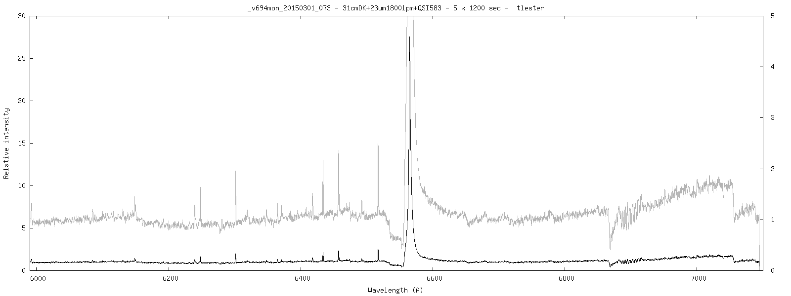 Observation of V694 Mon the 9.8 Feb. with a C11 and a Lhires III (1800 lines/mm grating for a R = 8800 resolution power). 35 microns slit wide :