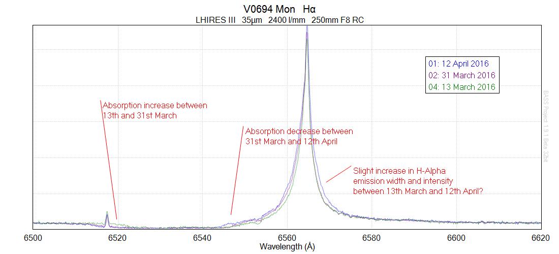 Here is a comparison of 3 high resolution H-alpha spectra covering about a month in time. I've labelled what appear to be some subtle changes in the profile. As the spectra are not flux calibrated I'm not sure how much confidence to give to the slight increase in H-alpha intensity and width.