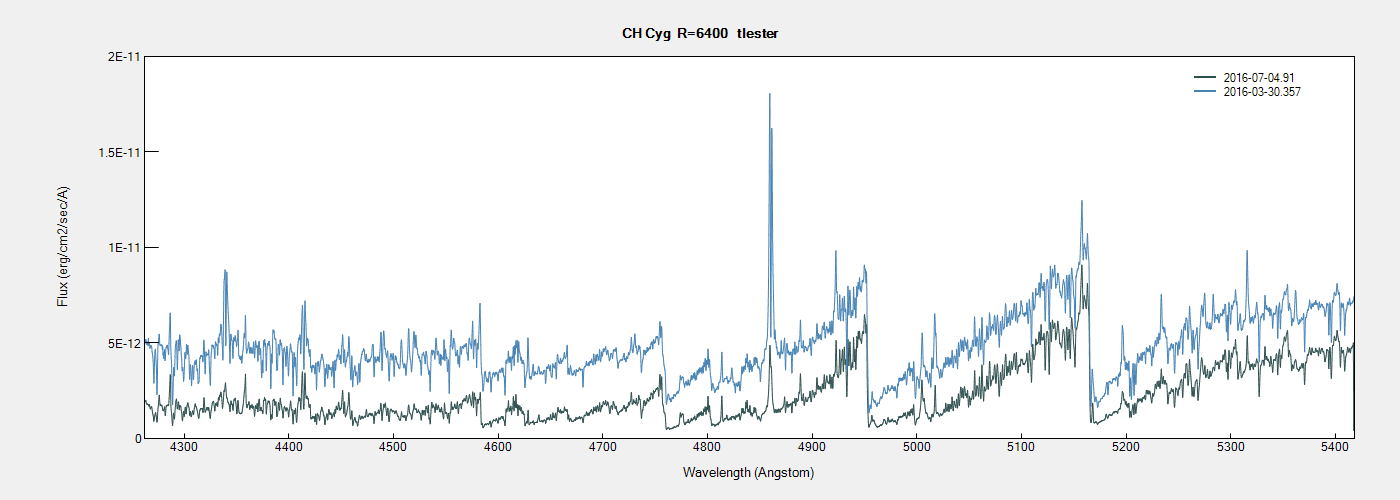 Here are my latest flux calibrated spectra for CH Cyg at Halpha and Hbeta compared to my last results before the recent drop in magnitude.