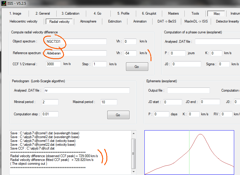Les paramètres retenus pour la CCF sont identiques à ceux de Christian Buil (voir figure ci-dessous) qui obtient une valeur de 728 km/s.