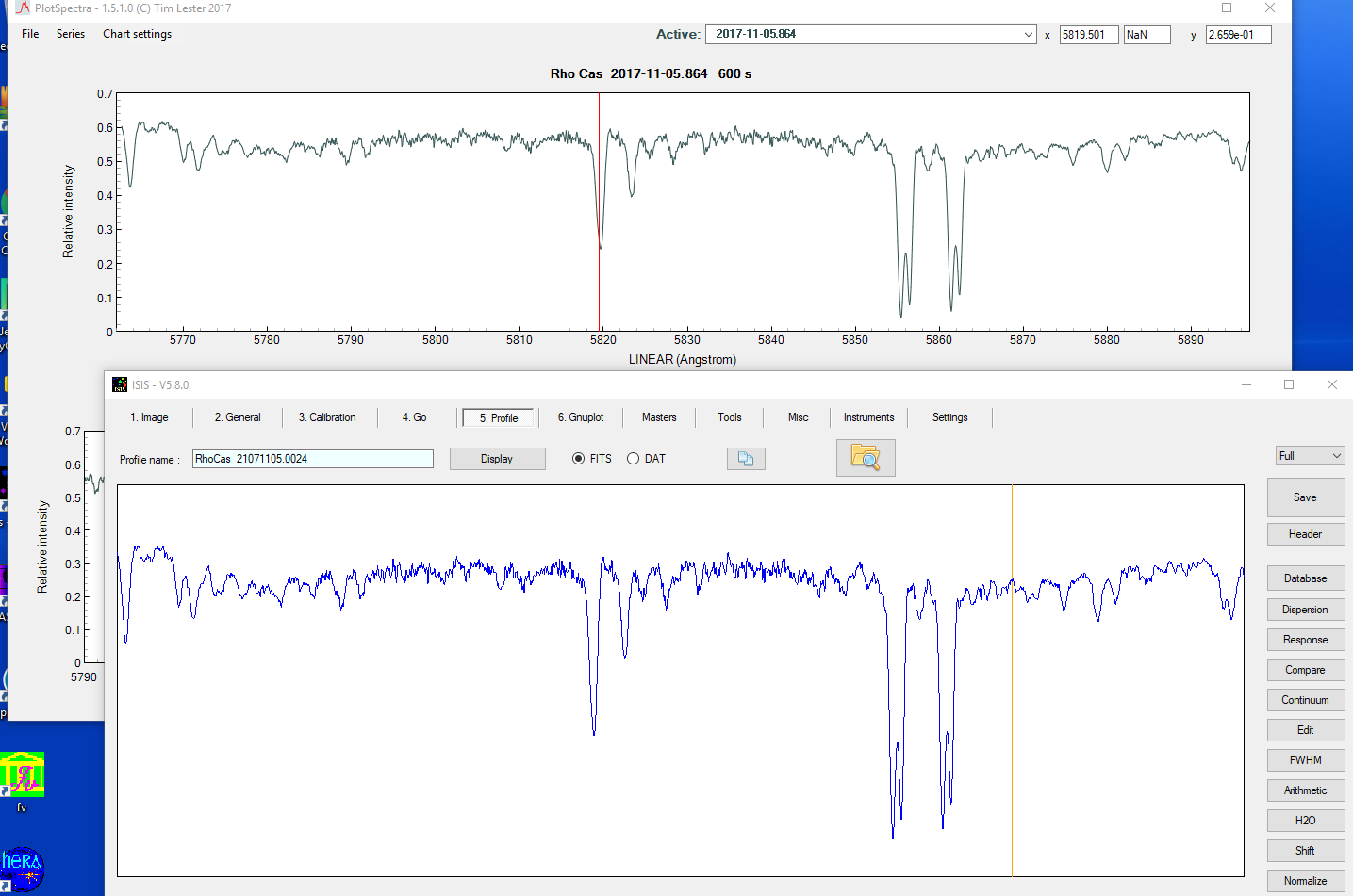 After considerable delay, including a change of mount, I managed on 2017 11 05 to do an automated capture of echellograms of Rho Cas managed by a Pyhon program controlling The Sky X. This included starting up slewing to the target, centering it on the guide head, auto guiding and capturing the echellograms (including calibration frames) before shutting down. (I also I nervously kept an eye out for spent fireworks as I have had rockets on the roof of the observatory before.)