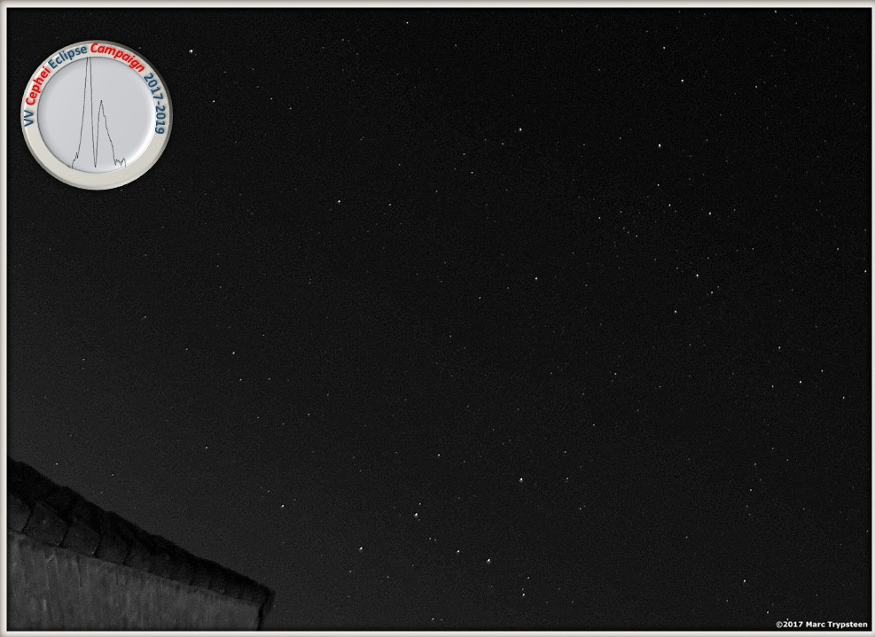 Polaris is positioned just above to the right of the logo. Cassiopeia at the bottom of the photograph and VV Cephei is clearly visible, ready to take a spectrum.