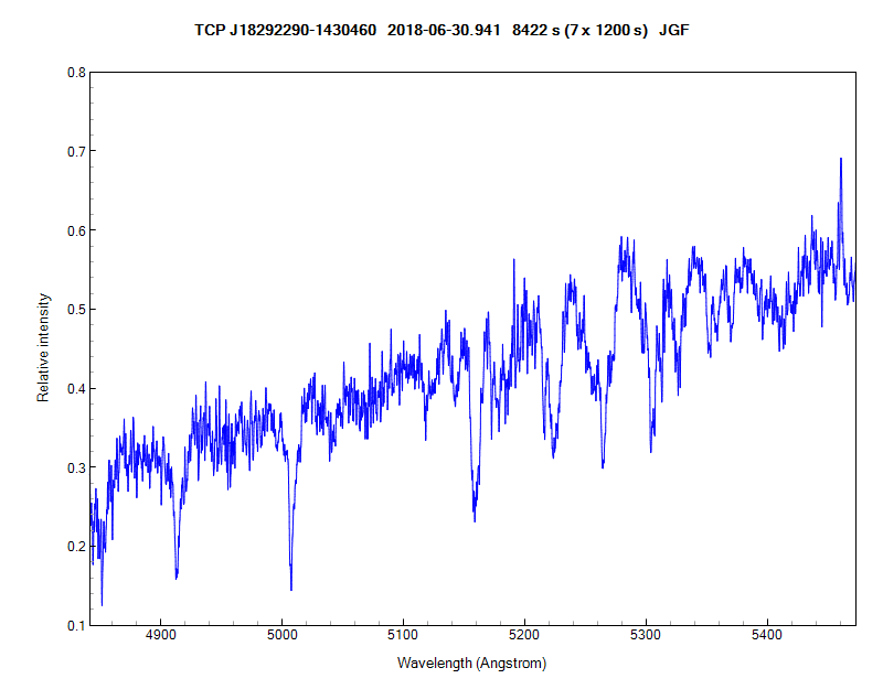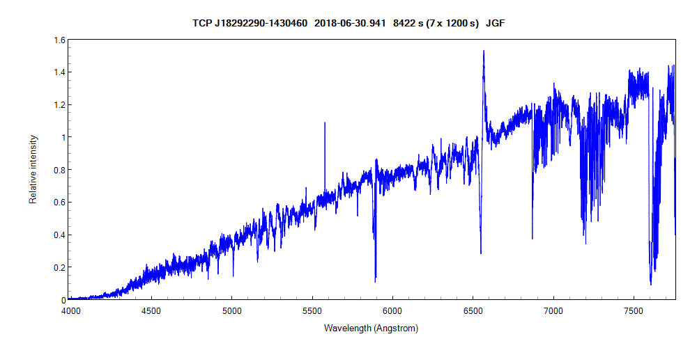 Spectra were taken concurrently with a C11 + LISA between 23.25 UT and 00.25 UT. R=1064. A mean V mag of 10.63 was adopted to flux calibrate the spectrum. As the average altitude of the nova was only 22 deg, atmospheric correction may be suspect.