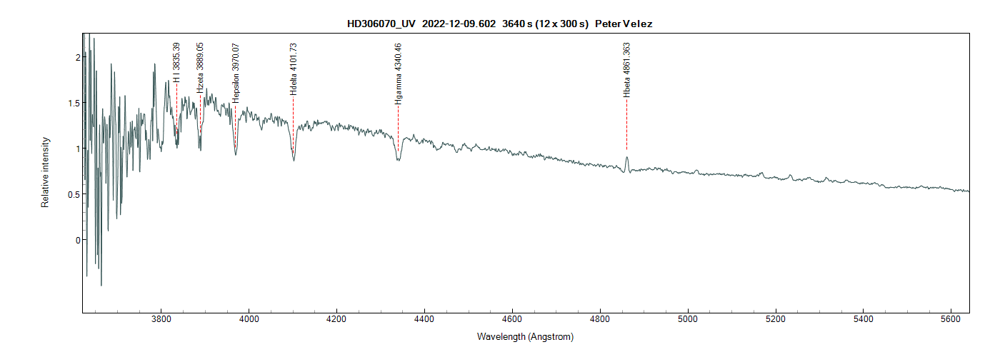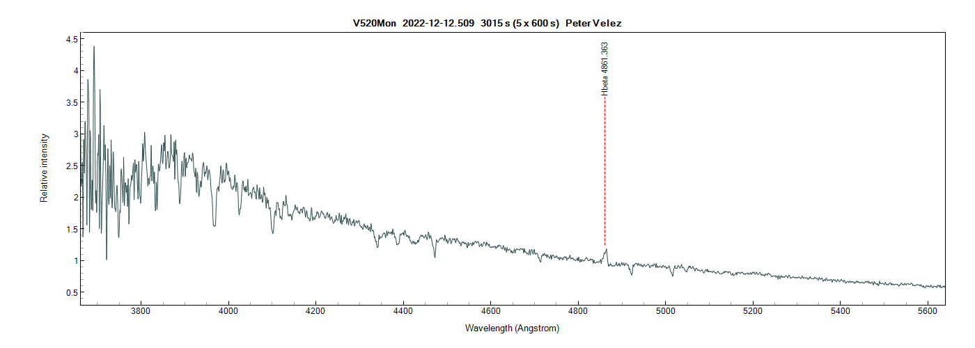 There is nothing particularly remarkable to see. Balmer and He I absorption lines. The H beta line is in emission and, like the spectrum from 10 December, the line is definitely split. I attach a plot of the UV spectrum and a subplot of the H beta line.